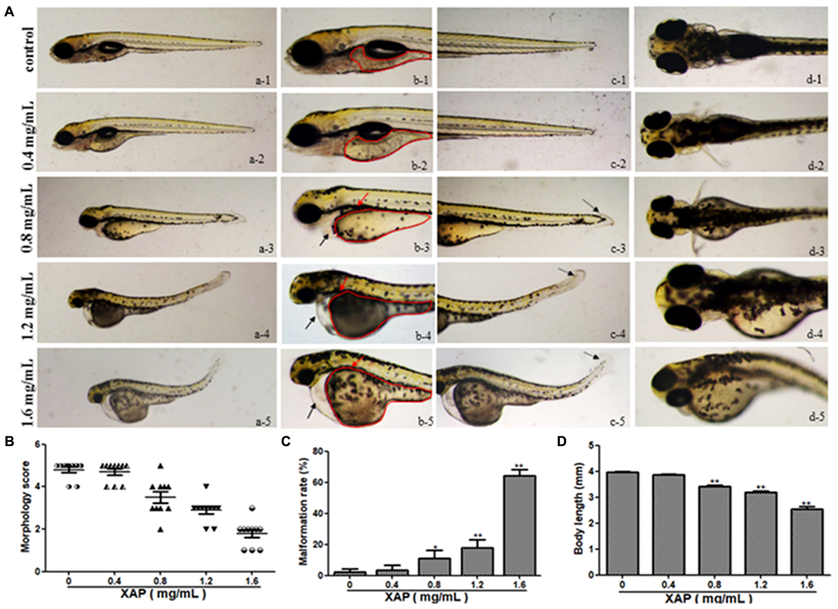 Body morphology effect of XAP exposure in zebrafish embryos at 120 hpe. (A) Representative lateral and ventral views of zebrafish larvae. Swim bladder deficiency is indicated by a solid red arrow. Yolk retention is indicated by the red outline. Pericardial edema is indicated by a solid black arrow. A slightly curved tail is indicated by a dotted black arrow. (B) Morphological scoring of XAP-exposed zebrafish embryos at 120 hpe. (C) Malformation rate of XAP-exposed zebrafish embryos at 120 hpe. (D) Body length of XAP-exposed zebrafish embryos at 120 hpe. ∗P < 0.05, ∗∗P < 0.01 versus control.