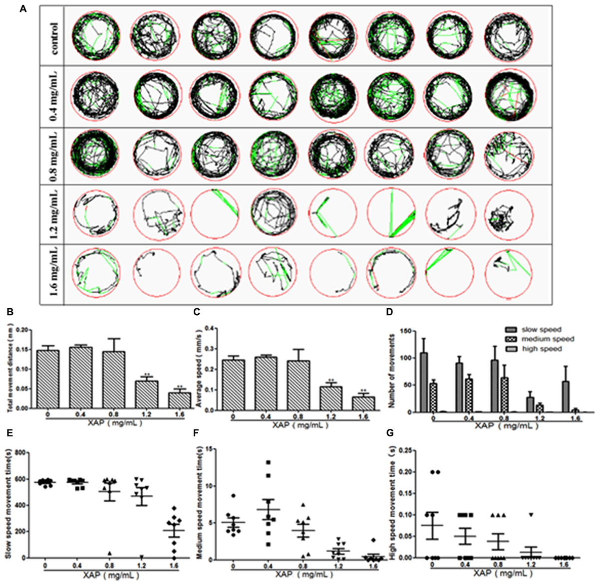Reduction of locomotor capacity following exposure to XAP. (A) Digital tracks of larvae from the 0, 0.4, 0.8, 1.2, and 1.6 mg/mL exposed groups at 120 hpe. (B) Total movement distance, (C) average speed, (D) number of movements, and (E–G) the average speed of larvae exposed to 0, 0.4, 0.8, 1.2, and 1.6 mg/mL XAP at 120 hpe. ∗P < 0.05, ∗∗P < 0.01 versus control. s, second.
