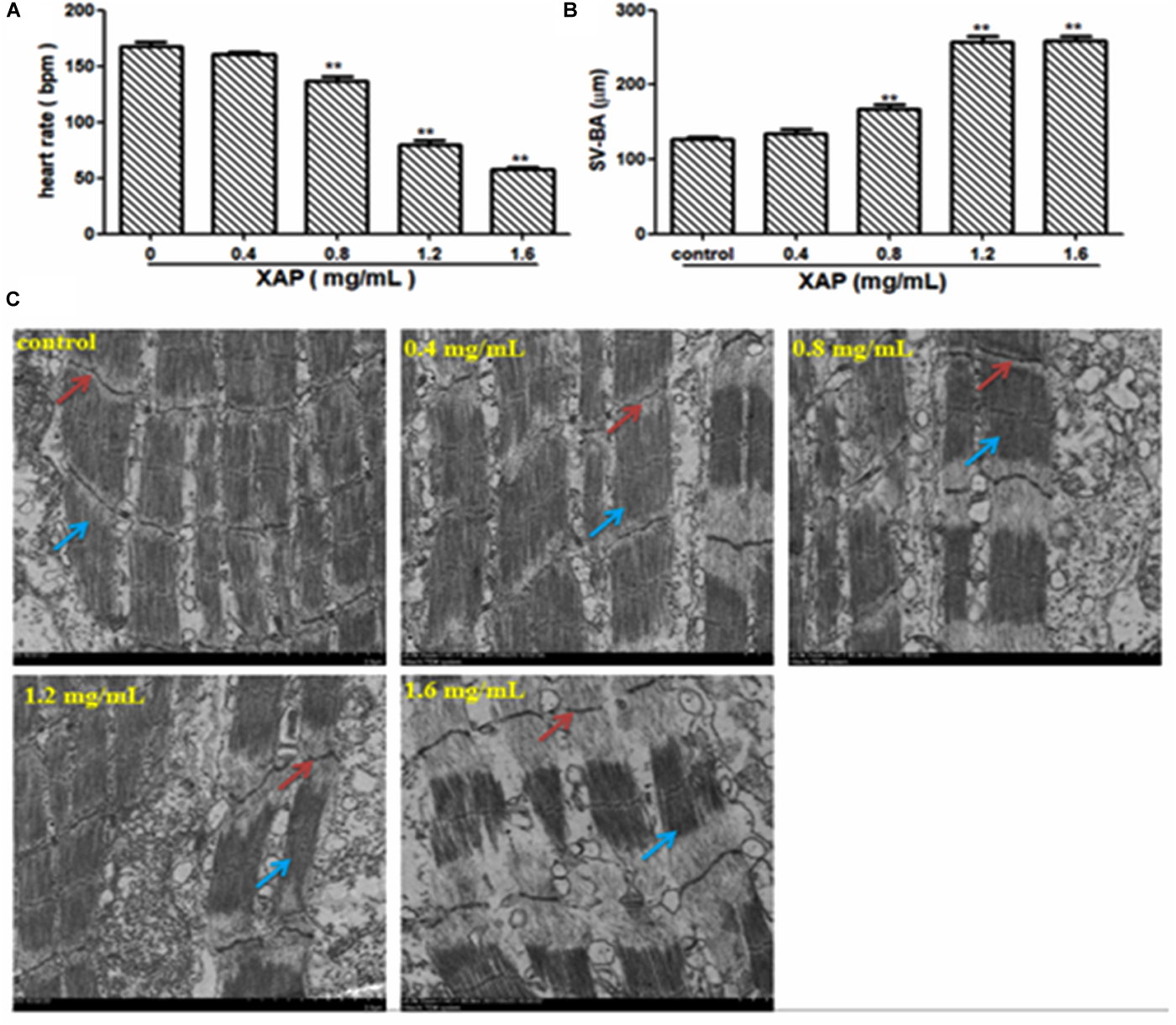 Heart toxicity effects of XAP in zebrafish embryos at 120 hpe. (A) The heart rate (beats/minute) in zebrafish larvae. (B) The SV-BA distance (μm) in zebrafish larvae. (C) The TEM image of zebrafish heart. Striated muscle is indicated by a solid red arrow, cardiac muscle fiber is indicated by a solid blue arrow. ∗P < 0.05, ∗∗P < 0.01 versus control. SV, sinus venous; BA, bulbus arteriosus; TEM, transmission electron microscope.