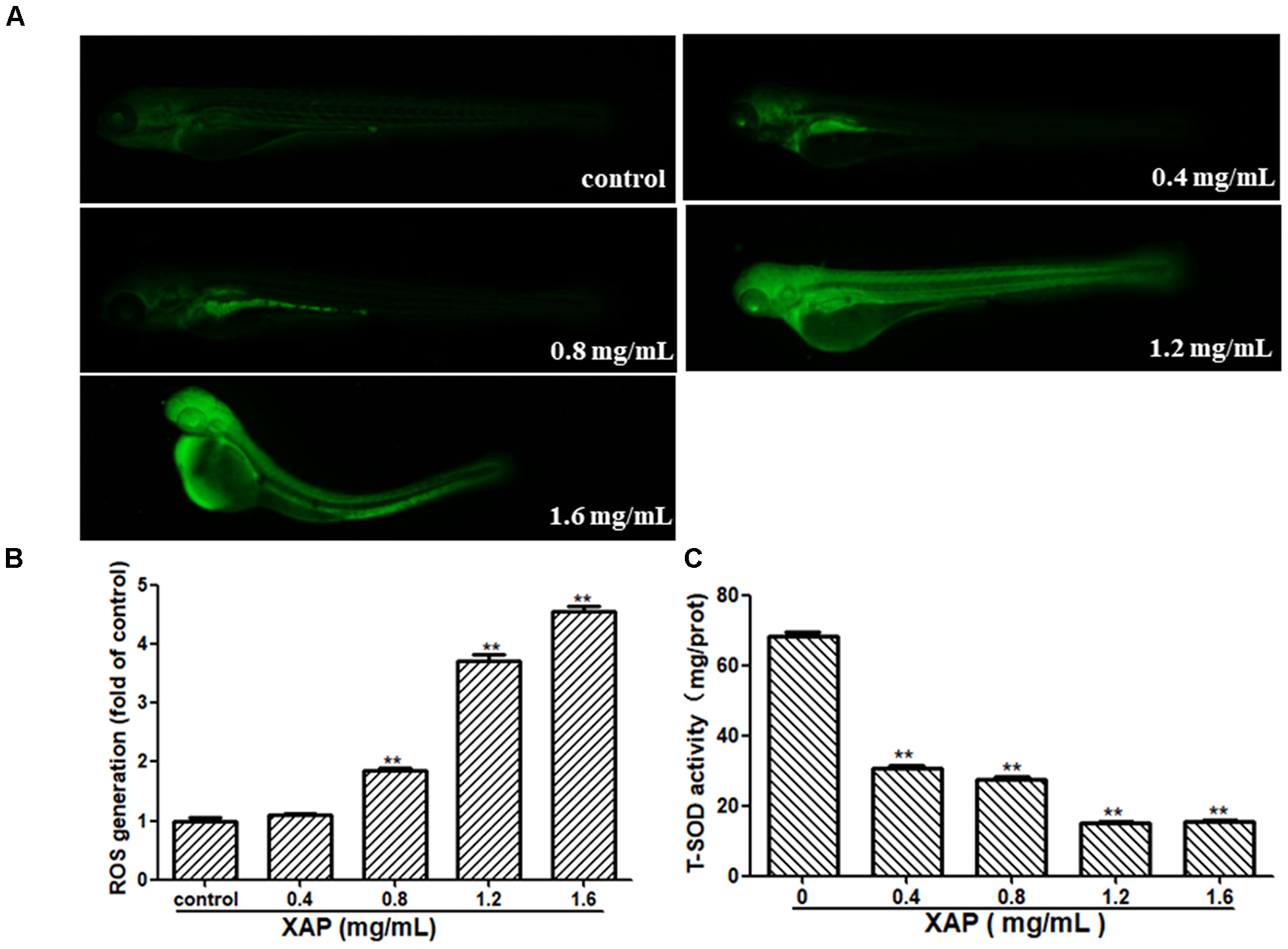 As shown in Figure 6A, we observed that there was no fluorescence in the control group, whereas there was a significant dose-dependent increase in fluorescence in the XAP-treated groups. This was consistent with the result in Figure 6B, showing that the generation of ROS followed an ascending trend in the treated groups (0.8, 1.2, and 1.6 mg/mL); meanwhile, the T-SOD activity was significantly decreased, which suggests that XAP likely induces oxidative stress in zebrafish in Figure 6C.