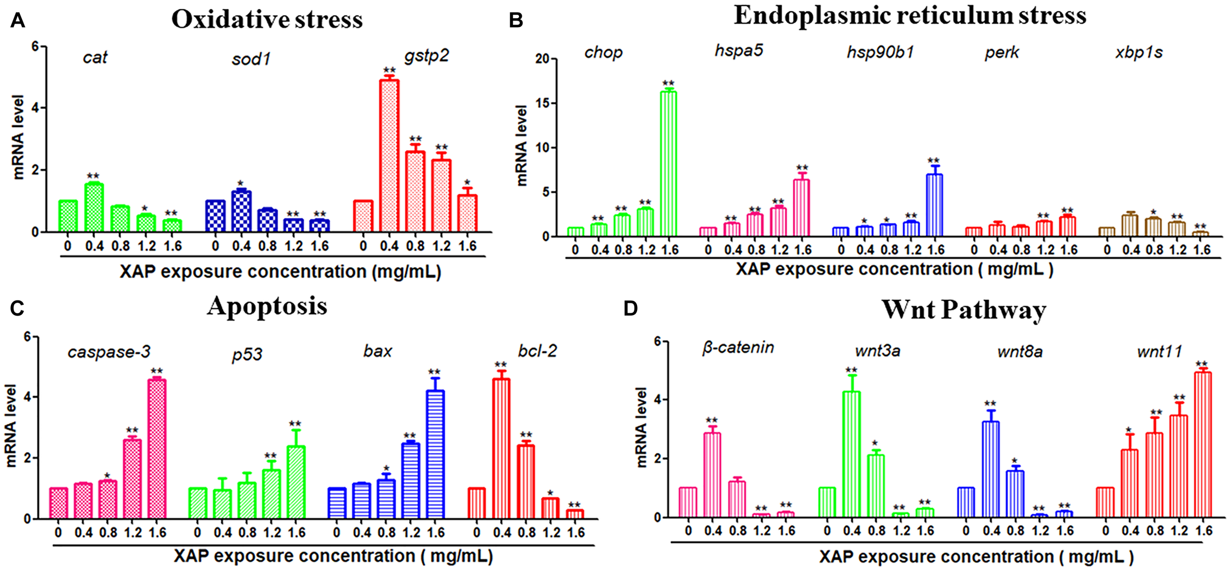 To investigate the possible mechanisms of the toxic effects induced by XAP, we used RT-PCR to examine the mRNA expression levels of larvae exposed by different XAP concentrations from 6 to 120 hpf. The RT-PCR results showed that the expression levels of the oxidative stress-related genes (cat, sod1, and gstp2) were upregulated in the XAP exposure group (0.4 mg/mL) compared with the control group, while they were downregulated in the other groups (1.2 and 1.6 mg/mL). The mRNA expression levels of ER stress-related genes (chop, hspa5, hsp90b1, and perk) and apoptosis-related genes (caspase-3, p53, and bax) increased with the increased XAP exposure dose. The mRNA expression level of bcl-2 was downregulated with increasing XAP exposure doses. The mRNA expression levels of Wnt pathway-related genes (β-catenin, wnt3a, and wnt8a) first increased and then decreased as the XAP exposure dose increased; however, the expression of wnt11 increased significantly with the increase of XAP exposure concentration in Figure 7.