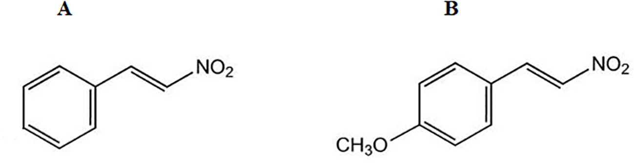 The synthesis of the two nitroderivatives was performed at the Department of Pharmacy, Federal University of Pará, Belém, PA, Brazil. NPe or 1-((E)-2-nitro-vinyl)-benzene (β-nitrostyrene) (Figure 1A) as well as its methoxy derivative 1-((E)-2-nitro-vinyl)-(4-methoxy)-benzene or T4MN (Figure 1B) were synthesized by employing the Claisen–Schmitd’s procedure (Vogel, 1989; Ford et al., 1994) according to a previously described method (Arruda-Barbosa et al., 2014; Arruda-Barbosa et al., 2017, respectively).