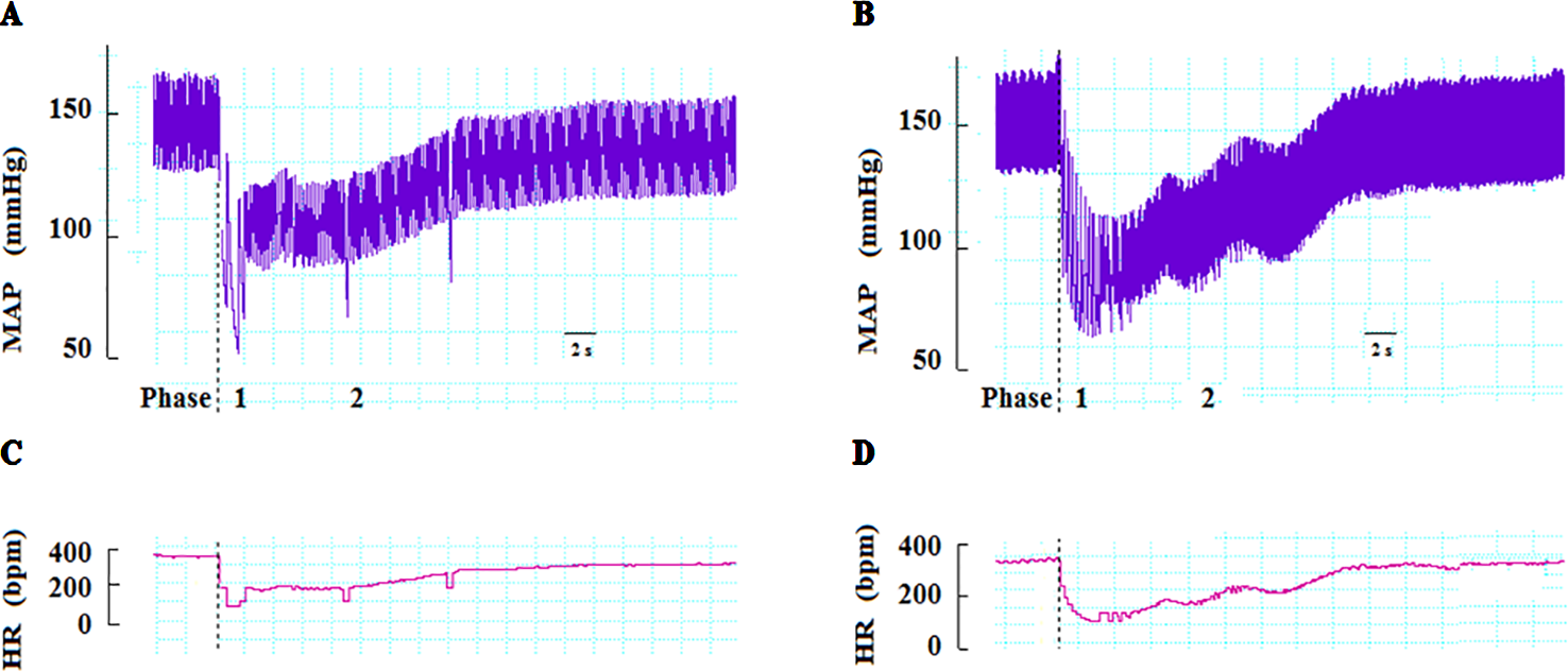 In pentobarbital-anesthetized SHRs (n = 32) without any treatment, the average baseline MAP and HR values were 143.2 ± 6.7 mmHg and 310 ± 12 bpm, respectively.