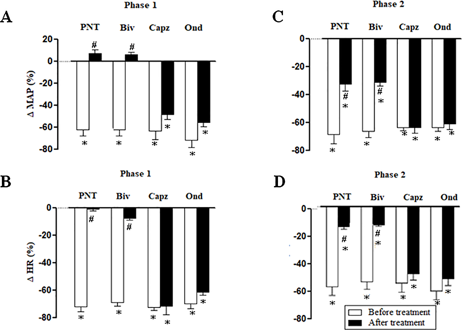Figure 4 Phase 1 decreases in mean arterial pressure (ΔMAP) and heart rate (ΔHR) (A and B, respectively) and phase 2 hypotensive and bradycardiac effects (C and D, respectively) elicited by intravenous (i.v.) administration of 1-nitro-2-phenylethene (NPe; 3 mg/kg) in four groups of pentobarbital-anesthetized spontaneously hypertensive rats: i) Before and after bivagotomy (Biv) at cervical level, ii) before and after perineural pretreatment (PNT) of both cervical vagi with capsaicin (250 μg/ml), iii) before and after pretreatment with capsazepine (Capz; 1 mg/kg, i.v.), and iv) before and after pretreatment with ondansetron (Ond; 30 μg/kg, i.v.). Data are the mean ± SEM and expressed as a percentage of baseline (n = 6 rats per group). *P < 0.05 and #P < 0.05 by paired Student’s t test vs. the respective baseline values and the corresponding responses before any pretreatment, respectively.