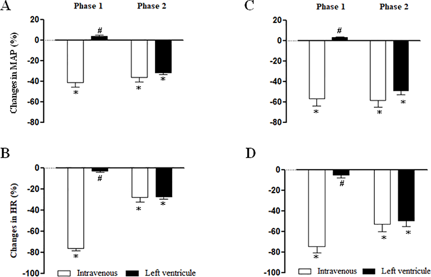 Figure 6 Maximal changes in mean arterial pressure (MAP) and heart rate (HR) induced by 1-nitro-2-phenylethene (NPe, 3 mg/kg) (A and B, respectively) and trans-4-methoxy-β-nitrostyrene (T4MN; 0.3 mg/kg) (C and D, respectively) injected into the left ventricle in pentobarbital-anesthetized spontaneously hypertensive rats which have been submitted 15 min earlier to an intravenous injection of NPe (3 mg/kg) or T4MN (0.3 mg/kg) (positive control). Data are expressed as the mean ± SEM and expressed as percentage of baseline (n = 5 per group). *P < 0.01 by paired Student’s t test vs. the corresponding baseline values. #P < 0.001 by Mann–Whitney U test vs. the corresponding responses to i.v. administration, respectively.