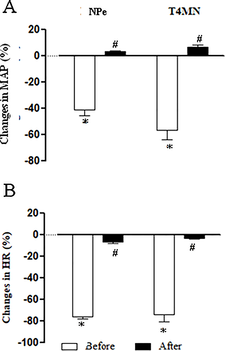 In the present study, baseline MAP and HR recorded in both conscious and pentobarbital-anesthetized SHRs were similar to those previously reported (Interaminense et al., 2011; de Barros Correia Junior et al., 2015). Magnitude of cardiovascular responses to i.v. NPe and T4MN in conscious SHRs was of the same order of magnitude as those recorded in anesthetized ones. This suggests that, unlike other anesthetic agents, pentobarbital anesthesia is preferable to assess cardiac function in rats since it induced less influence on baseline HR, as previously reported (Kawahara et al., 2005; Stein et al., 2007; Sano et al., 2016). As previously reported for NPa (de Siqueira et al., 2010; Interaminense et al., 2011), i.v. injection of NPe (doses of ≥0.3 mg/kg) and T4MN (doses of ≥0.05 mg/kg) elicited biphasic hypotension and bradycardiac effects. Essentially, a fast component (phase 1) followed by a slow component (phase 2) with a time of latency of 1–2 s and nearly 7–9 s, respectively. To the best of our knowledge, this is the first time that the reversible cardiovascular effects of NPe and T4MN are reported in SHRs.