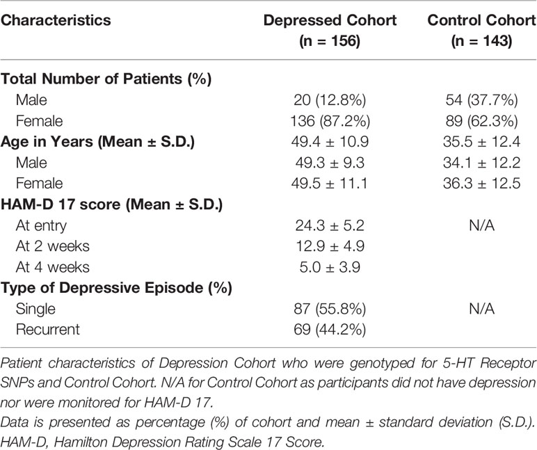 From the initial cohort, 156 patients consisting of 20 men and 136 women, aged 49.4 ± 10.9 years (mean ± standard deviation), were genotyped for the 5-HT receptor SNPs. Over the course of 4 weeks, HAM-D 17 was taken at entry (HAM-D 17 score: 24.3 ± 5.2), at 2 weeks (HAM-D 17 score: 12.9 ± 4.9) and at 4 weeks (HAM-D 17 score: 5.0 ± 3.9) (Table 1). The control cohort included 143 patients, comprising of 54 male and 89 women and aged 35.5 ± 12.4 years. The control cohort was genotyped for 5-HT2C receptor SNPs to determine the Odds Ratio for depression, when compared to the depression cohort.