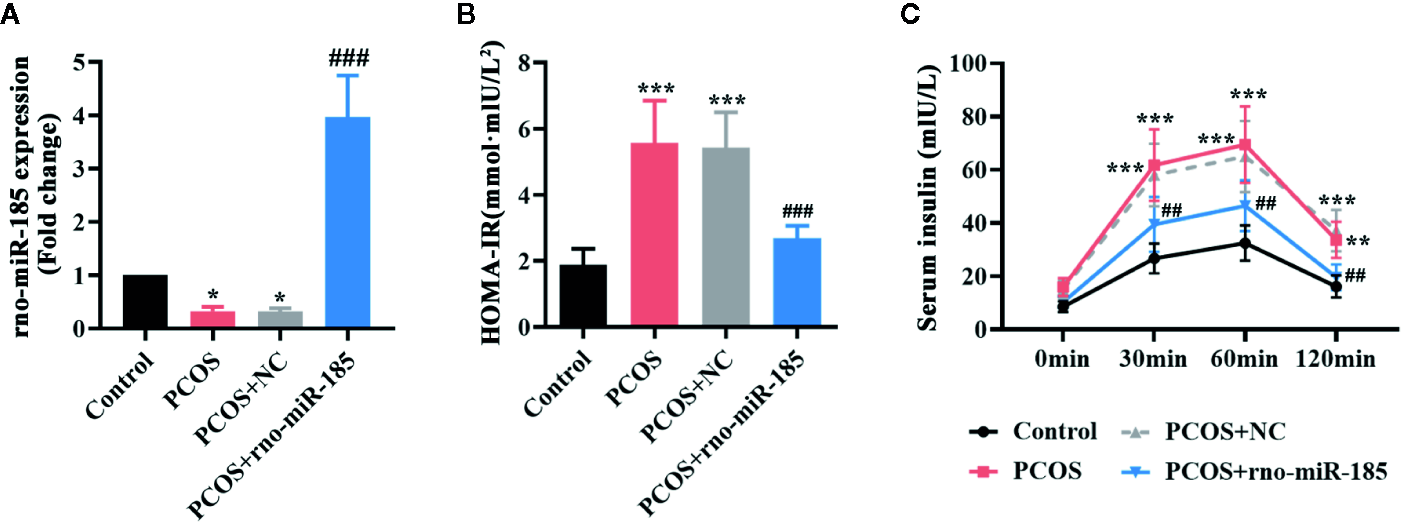 MiR-185 ameliorated the insulin release in PCOS model. (A) Relative levels of miR-185 were decreased in the ovaries of PCOS rats and increased by its specific lentivirus. (B, C) The HOMA-IR value (B) and serum insulin level (C) in PCOS rats were suppressed by miR-185. *p < 0.05, **p < 0.01, ***p < 0.001 vs Control. ##p < 0.01, ###p < 0.001 vs PCOS + NC.