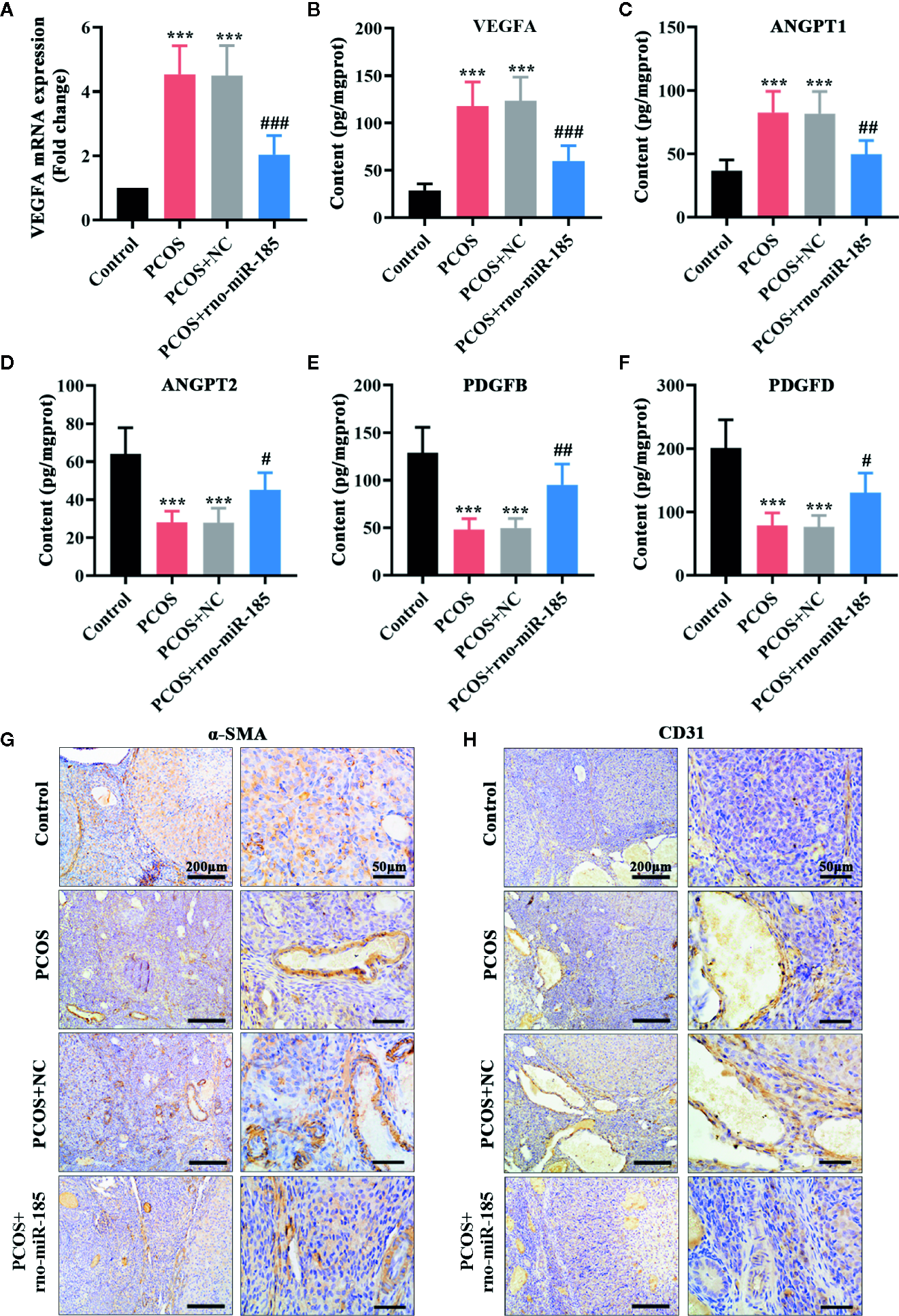 MiR-185 inhibited the angiogenic effect in the ovaries of PCOS rats. (A) Relative mRNA levels of VEGFA were tested using qRT-PCR. (B–F) The concentrations of VEGFA (B), ANGPT1 (C), ANGPT2 (D), PDGFB (E) and PDGFD (F) were measured by ELISA. (G, H) The immunopositive staining of α-SMA (G) and CD31 (H) were examined with immunohistochemistry. Left panel: Scale bar = 200 μm; Right panel: Scale bar = 50 μm. ***p < 0.001 vs Control. #p < 0.05, ##p < 0.01, ###p < 0.001 vs PCOS + NC.