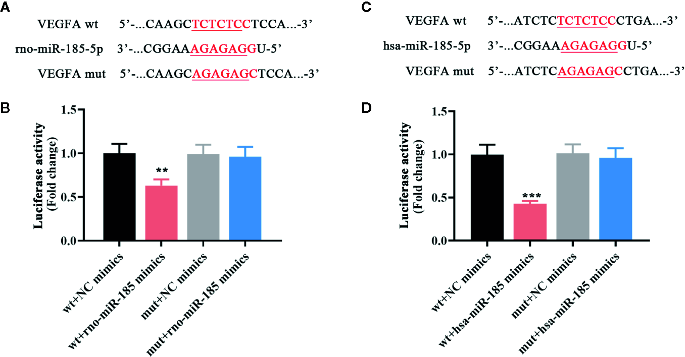 MiR-185 directly targeted VEGFA. (A) The putative binding sites of rno-miR-185-5p with VEGFA. (B) Relative luciferase activity between rno-miR-185-5p and VEGFA was detected. (C) The putative binding sites of hsa-miR-185-5p with VEGFA. (D) Relative luciferase activity between hsa-miR-185-5p and VEGFA was detected. Red sequences: binding sites. Underlined sequences: mutant sites. **p < 0.01, ***p < 0.001 vs wt + NC mimics.