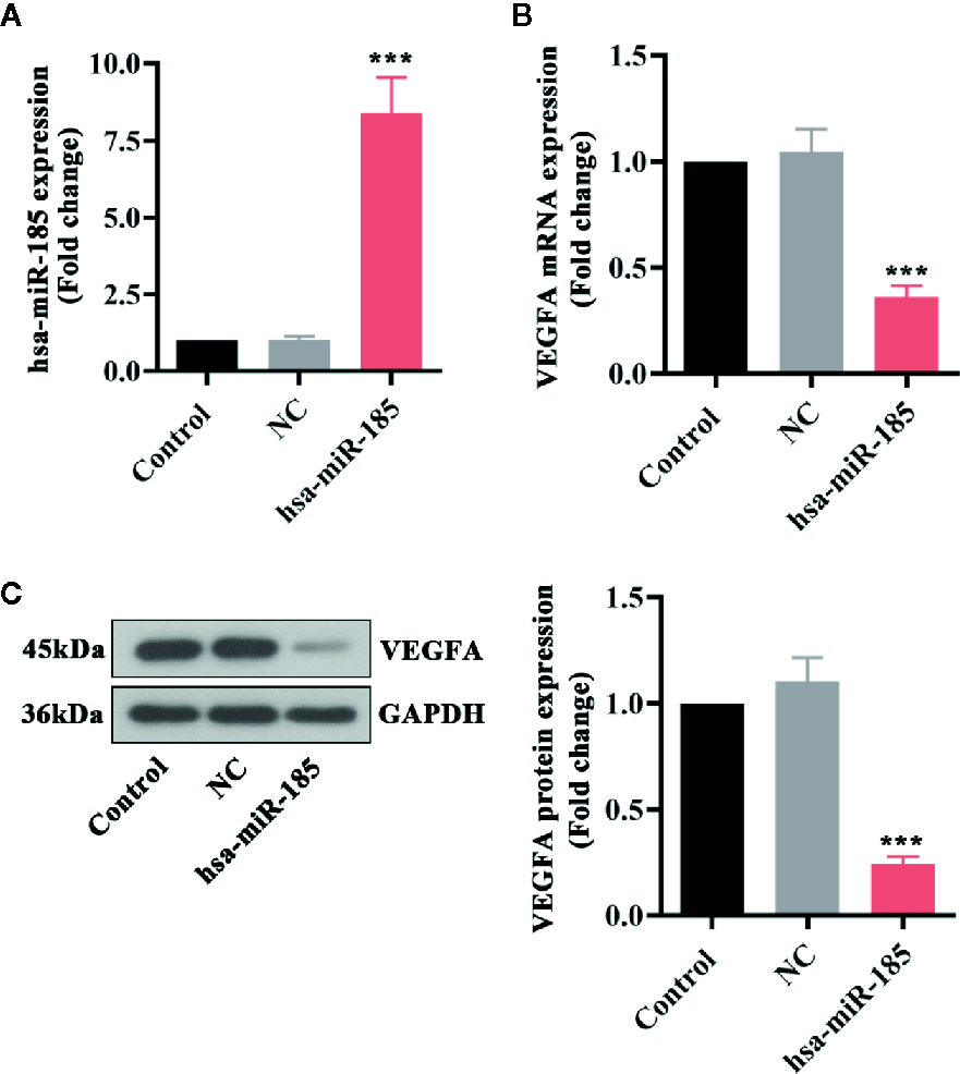 Overexpression of miR-185 reduced VEGFA expression in HOMECs. (A) Relative levels of miR-185 were elevated by its specific lentivirus in HOMECs. (B, C) Relative VEGFA mRNA (B) and protein (C) levels were decreased by upregulating miR-185 in HOMECs. ***p < 0.001 vs NC.