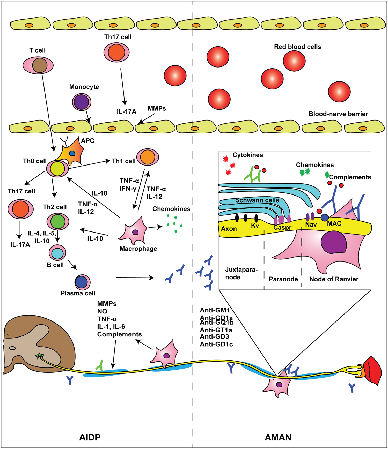 Pathogenesis of AIDP and AMAN. The pathogenesis varies among different subtypes of GBS. In AIDP, Th0 cells go across the BNB and develop into Th1, Th2, or Th17 cells after stimulated by APCs. Th1 cells release TNF-α and IFN-γ, facilitating macrophage recognizing Schwann cells and stripping off the myelin sheath. Th2 cells promote the proliferation and differentiation of B cells. Mature B cells develop into plasma cells and produce pathogenic antibodies. Activated macrophages interact with immune cells and cause a storm of inflammation-associated chemokines and cytokines. In AMAN, antiganglioside antibodies recognize the node of Ranvier and cause axonal degeneration via MAC. Some autoantibodies may also target Schwann cells and trigger demyelination. Abbreviations: AIDP, acute inflammatory demyelinating polyneuropathy; AMAN, acute motor axonal neuropathy; APC, antigen-presenting cell; BNB, blood–nerve barrier; Caspr, contactin-associated protein; FasL, Fas–Fas ligand; GBS, Guillain–Barré syndrome; IFN-γ, interferon γ; IL, interleukin; Kv, voltage-gated potassium channels; MAC, membrane attack complex; MMPs, metalloproteinases; Nav, voltage-gated sodium channels; NO, nitrogen oxide; TGF-β, transform growth factor-β; Th cell, T helper cell; TNF-α, tumor necrosis factor-α.
