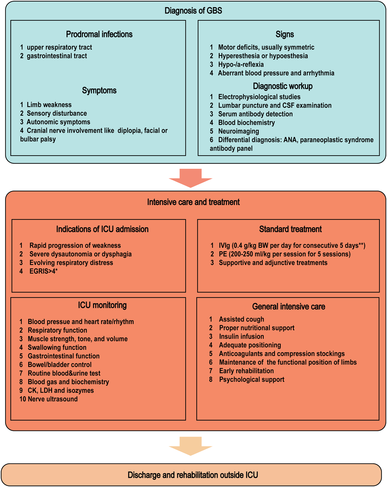 ICU admission and management of severe GBS. The diagnosis of GBS is based on the prodromal infections, symptoms, and signs combined with laboratory workups including electrophysiological studies and CSF/serum tests. Pharmacological treatments should be applied immediately in progressive GBS patients who cannot walk without aid. Decision-making as to ICU admission should be based on EGRIS, respiratory function, and extent of dysautonomia/dysphagia. The ICU monitoring of physiological parameters facilitates the recognition of GBS progression and the decision-making process for neurointensivists. *EGRIS is calculated via integrating MRC scores, facial/bulbar weakness, and duration from the onset to admission. **IVIg at 2g/kg BW can even be completed within 2 or 1 day in heathy cohorts, especially for young patients with normal cardiac and renal functions. Abbreviations: ANA, antinuclear antibody; BW, body weight; CK, creatine kinase; CSF, cerebrospinal fluid; EGRIS, Erasmus GBS respiratory insufficiency score; GBS, Guillain–Barré syndrome; ICU, intensive care unit; IVIg, intravenous immunoglobulin; LDH, lactate dehydrogenase; MRC, Medical Research Council; PE, plasma exchange.