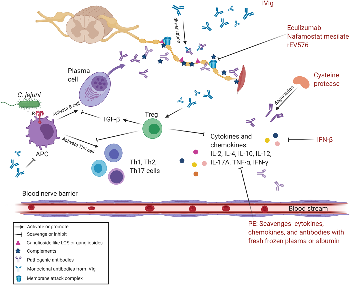 Pharmacological therapeutic targets of GBS. The hyperreactive cellular and/or humoral immune responses in GBS are the main targets of current pharmacological interventions. IVIg can inhibit the production of pathogenic antibodies and pro-inflammatory mediators released by T helper cells and activated B cells via functioning on Tregs. IVIg also promotes the dimerization of antiganglioside antibodies and inhibits APCs to alleviate immune responses. PE mainly replaces plasm rich in antiganglioside antibodies and pro-inflammatory mediators with fresh frozen plasma/albumin. Eculizumab, nafamostat mesilate, and rEV576 are complement inhibitors that can prevent MAC formation. IFN-β attenuates inflammation induced by cytokines and chemokines. Cysteine protease degrades pathogenic antibodies and mitigates hyperreactive immune responses. Abbreviations: APC, antigen-presenting cell; C. jejuni, Campylobacter jejuni; GBS, Guillain–Barré syndrome; IFN-β, interferon β; IL, interleukin; IVIg, intravenous immunoglobulin; LOS, lipo-oligosaccharide; MAC, membrane attack complex; PE, plasma exchange; TGF-β, transform growth factor β; Th cell, T helper cell; TLR, Toll-like receptor; TNF-α, tumor necrosis factor-α; Treg, regulatory T cell.