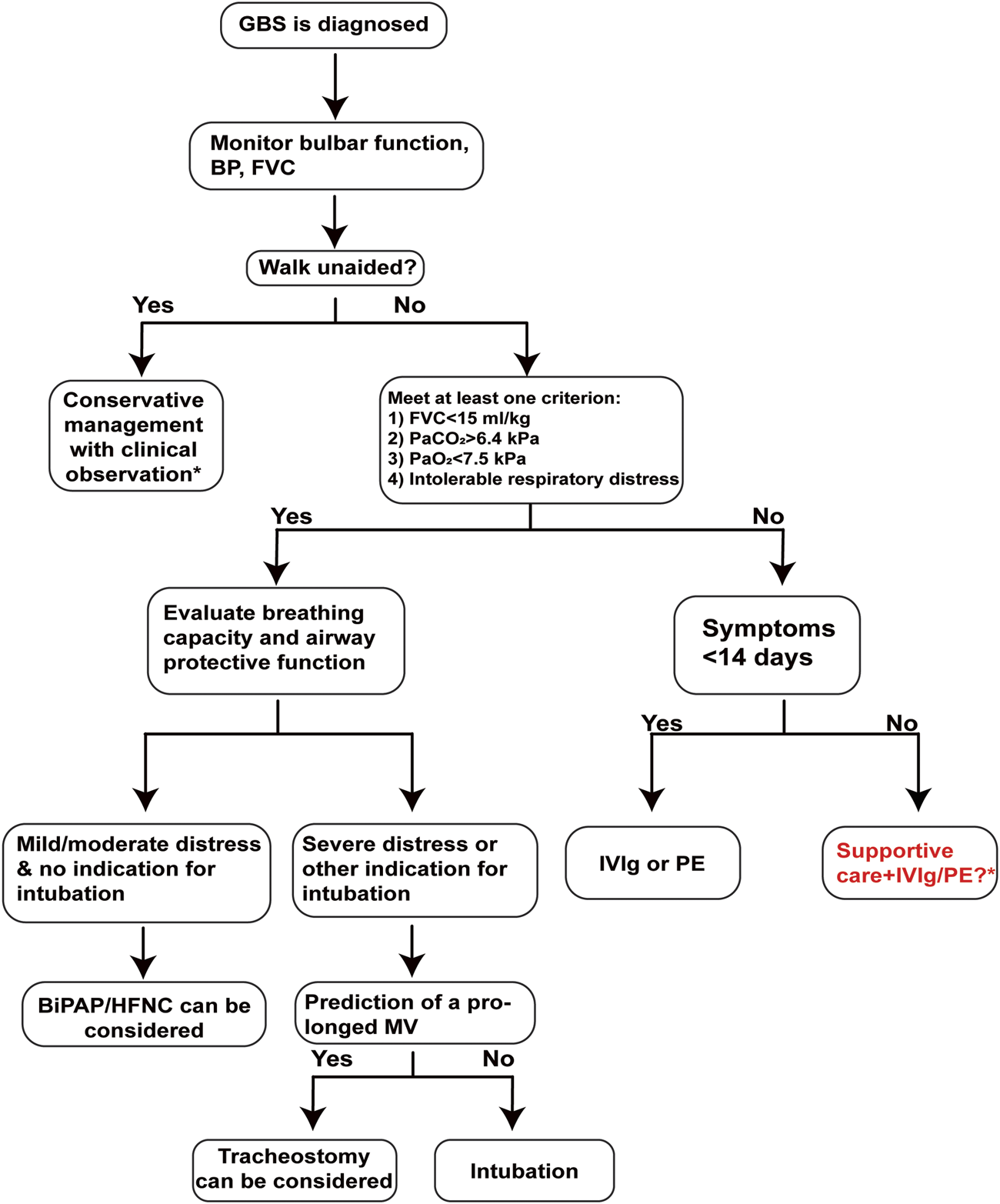A pragmatic decision-making workflow for the intensive care and treatment of GBS. Clinical decision on MV is closely correlated to the prognosis of GBS patients. The strict screening steps rely on dynamic measurements of disease progression and respiratory functions, which are vital for the implementation of proper individualistic therapeutic strategies. A decision for noninvasive ventilation, tracheal intubation with MV, or tracheostomy relies on the respiratory capacity and airway protection capacity of GBS patients. *Treatment dilemmas occur in patients with relatively mild symptoms or when the plateau of weakness was more than 2 weeks before. Abbreviations: BiPAP, bilevel positive airway pressure; BP, blood pressure; EGRIS, Erasmus GBS respiratory insufficiency score; FVC, forced vital capacity; GBS, Guillain–Barré syndrome; HFNC, high-flow nasal cannula; ICU, intensive care unit; IVIg, intravenous immunoglobulin; MV, mechanical ventilation; PE, plasma exchange.