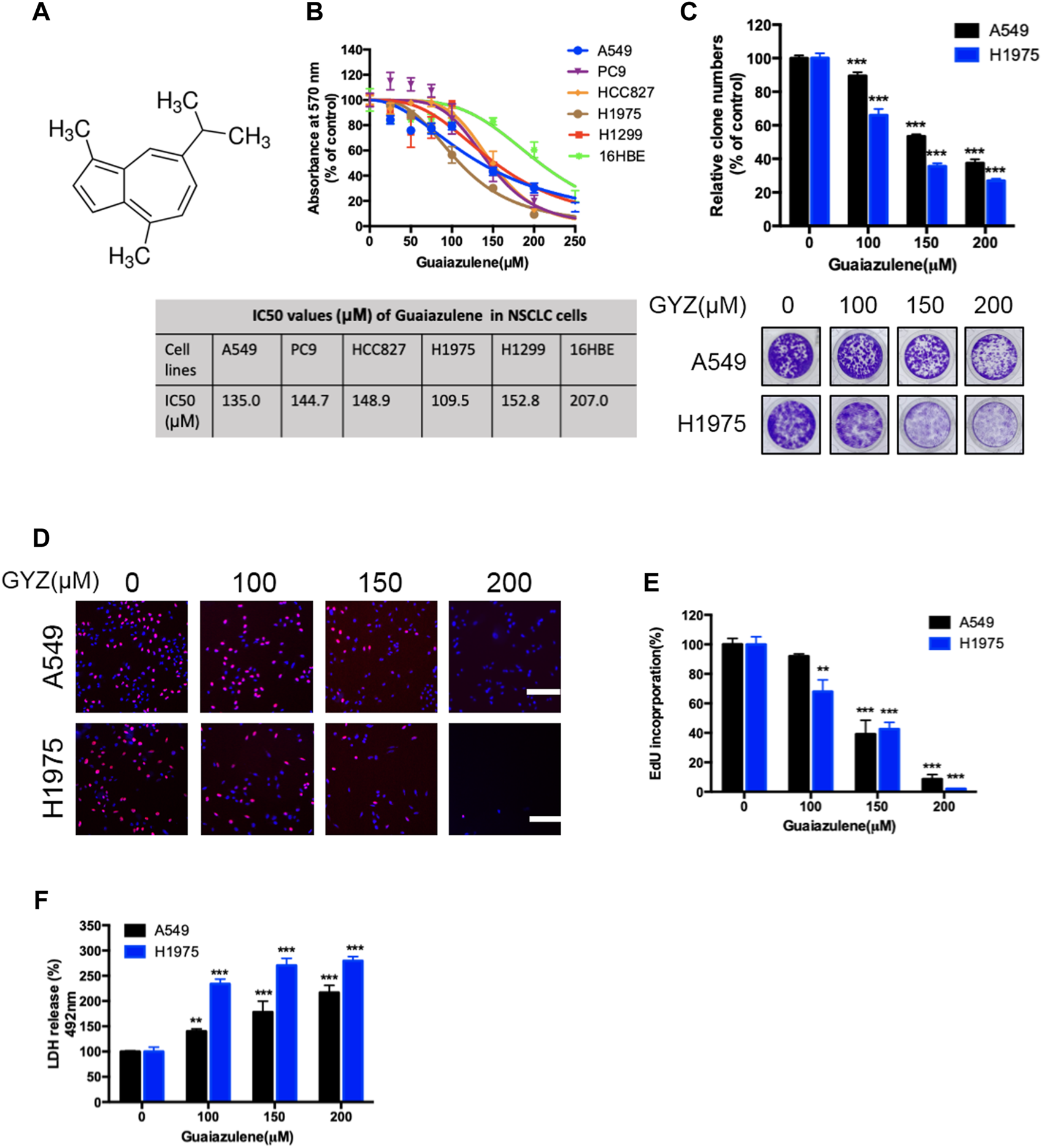 GYZ inhibits the growth of NSCLC cells in vitro. (A) Chemical structure of GYZ. (B) NSCLC cells were treated with GYZ at the indicated concentrations for 48 h, and cell growth was measured by MTT assay. (C–E) A549 cells and H1975 cells were treated with GYZ at the indicated concentrations (the tested doses of guaiazulene were determined by the IC50 values). Cell proliferation was performed by colony formation (C) and EdU incorporation (D,E) assays. (F) Cells were subjected to GYZ for 48 h, and cytotoxicity was examined by the release of LDH.