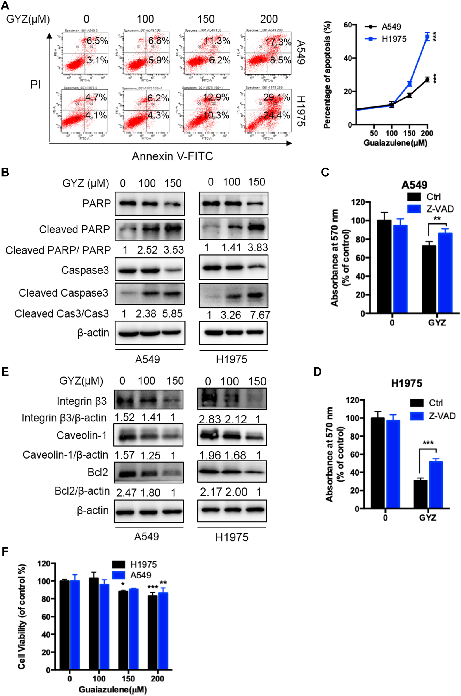 GYZ triggers apoptosis in NSCLC cells. (A) annexin V–FITC/PI staining was used to detect the apoptotic effects induced by GYZ in NSCLC cells. (B) Immunoblot analysis of Cleaved PARP, PARP, Cleaved Caspase3, Caspase3 expression in NSCLC cells treated with the indicated concentrations of GYZ for 48 h. (C,D) The MTT assay determined cell growth of NSCLC cells treated with GYZ (150 μM) in the absence or presence of 10 μM Z-VAD for 48 h. (E) Immunoblot analysis of Integrin β3, Caveolin-1, Bcl2 expression in NSCLC cells treated with the indicated concentrations of GYZ for 48 h. (F) GYZ at the indicated concentrations induced anoikis in NSCLC cells that were cultured under detachment environment for 24 h. All data are means ± SD. *p < 0.05, **p < 0.01, ***p < 0.001.