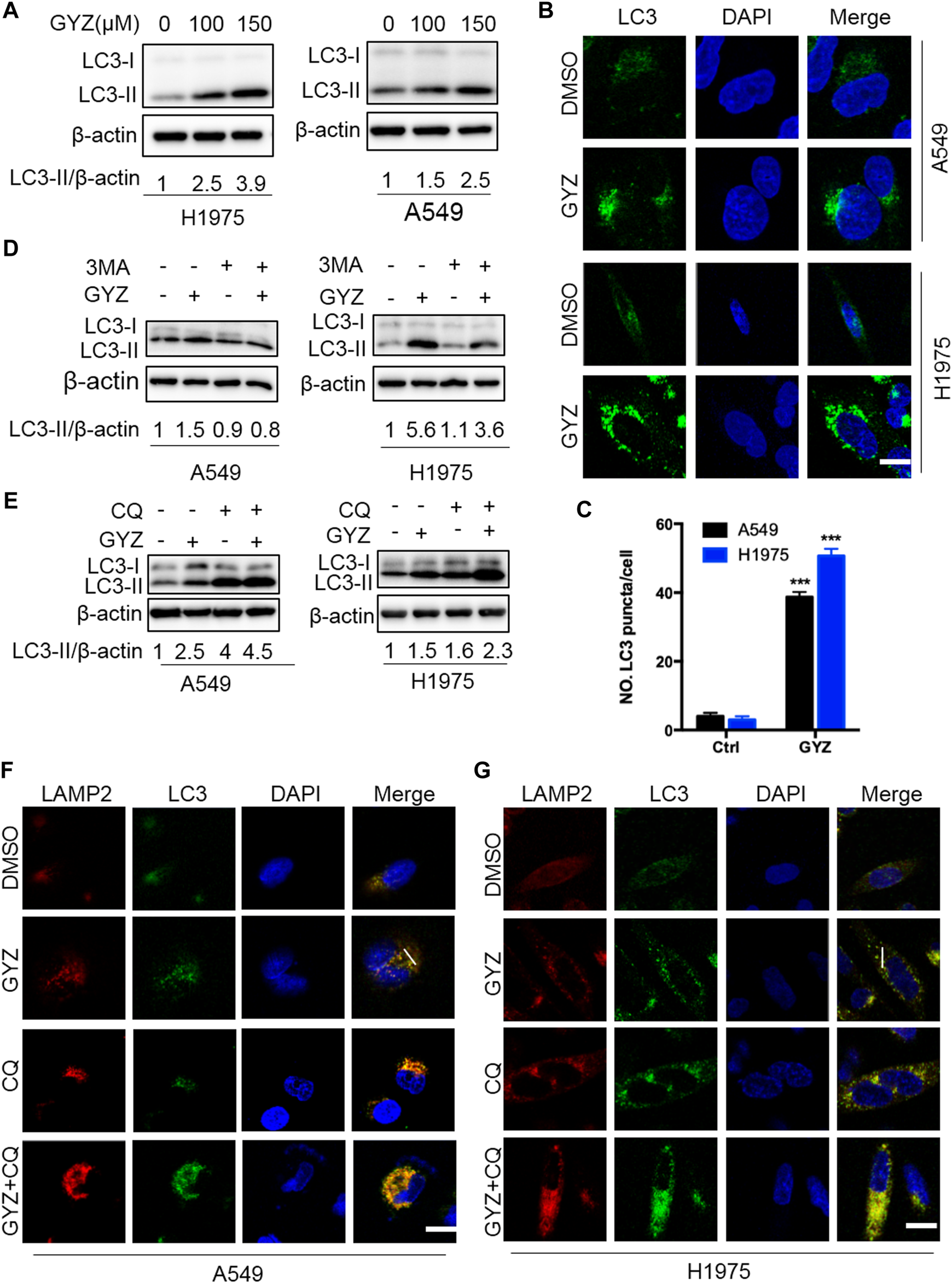 GYZ stimulates autophagy in NSCLC cells. (A) Immunoblot analysis of LC3 turnover expression in NSCLC cells treated with vehicle or GYZ for 24 h. (B,C) Immunofluorescent analysis of the accumulation of endogenous LC3 puncta in the absence or presence of GYZ (A549 150 μM, H1975 100 μM) for 24 h. Scale bars, 10 μm. (D) NSCLC cells were treated with vehicle, GYZ (A549 150 μM, H1975 100 μM), 3-MA (10 mM), or in combination for 24 h. Immunoblot analysis was used to examine LC3 turnover. (E) NSCLC cells were treated with GYZ (A549 150 μM, H1975 100 μM) with or without CQ (5 μM) for 24 h. LC3 turnover was detected by immunoblotting. (F,G) The colocalization of endogenous LC3 with LAMP2 was quantitated by immunofluorescent analysis in the treatment of GYZ (A549 150 μM, H1975 100 μM) with or without CQ (5 μM) for 24 h. Scale bars, 10 μm.