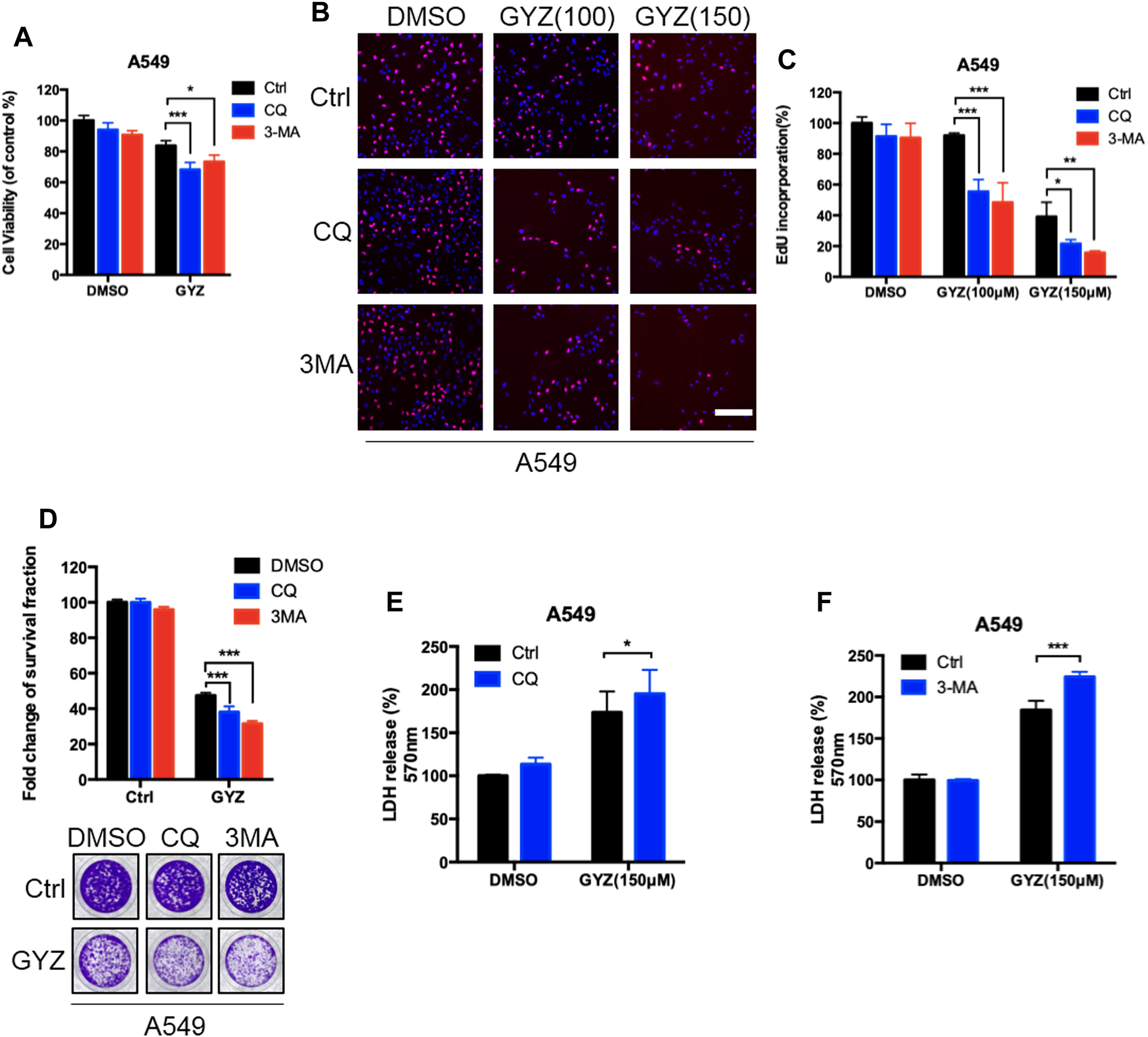 Inhibition of autophagy augments the antitumor activity of GYZ in NSCLC cells. (A) A549 cells were treated with 3-MA (10 mM) or CQ (5 μM) in the absence or presence of GYZ (100 μM) for 48 h. Cell growth was evaluated by MTT assay. (B, C) A549 Cells were treated with the indicated concentrations of GYZ in the absence or presence of 3-MA (10 mM) or CQ (5 μM). Cell proliferation was detected by EdU incorporation assay. (D) A549 cells were treated with CQ (5 μM) or 3-MA (10 mM) in the absence or presence of GYZ (150 μM) for 2 weeks. Cell proliferation was performed by colony-formation assay. E, F) A549 cells were treated with 3-MA (10 mM) or CQ (5 μM) in the absence or presence of GYZ (150 μM) for 48 h. The cytotoxicity was examined by the release of LDH. All data are means ± SD. *p < 0.05, **p < 0.01, ***p < 0.001.