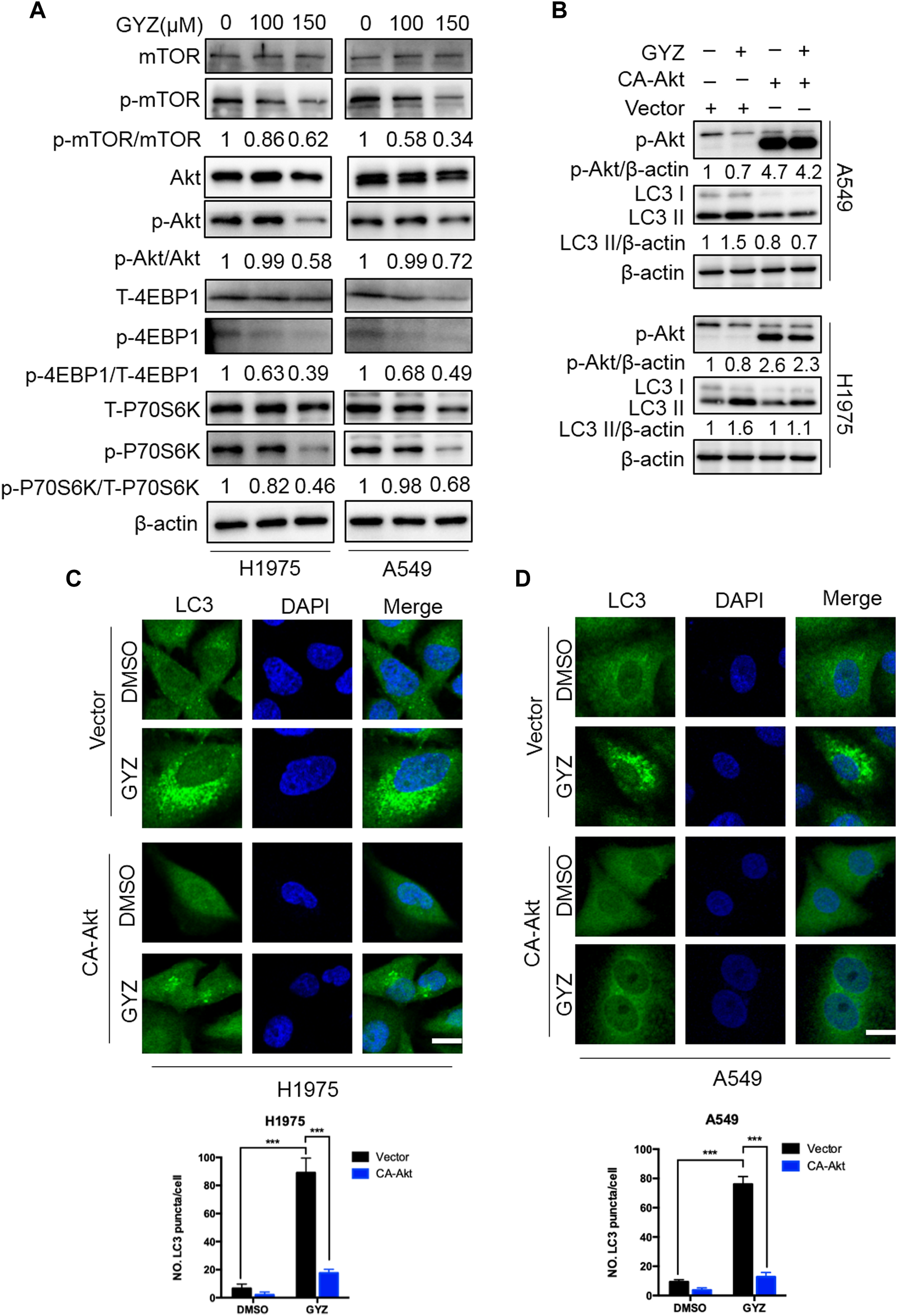 Inhibition of Akt/mTOR signaling is responsible for GYZ-induced autophagy. (A) Immunoblot analysis of phosphorylation of mTOR, Akt, 4EBP1 and p70S6K expression in NSCLC cells treated with the indicated concentrations of GYZ for 24 h. Total mTOR, Akt, 4EBP1, and p70S6K expression was examined as the internal control, respectively. (B) Cells were transfected with empty vectors (pECE) or with constitutively active CA-Akt plasmids for about 36 h, and then cells were treated with GYZ (150 μM) for another 24 h. Akt phosphorylation, and LC3 turnover were detected by immunoblotting. (C,D) H1975 cells (C) and A549 cells (D) were transfected with constitutively active CA-Akt plasmids or with empty vectors (pECE) for about 36 h in the absence or presence of GYZ (A549 150 μM, H1975 100 μM) for 24 h. Scale bars, 10 μm. All data are means ± SD. ***p < 0.001.