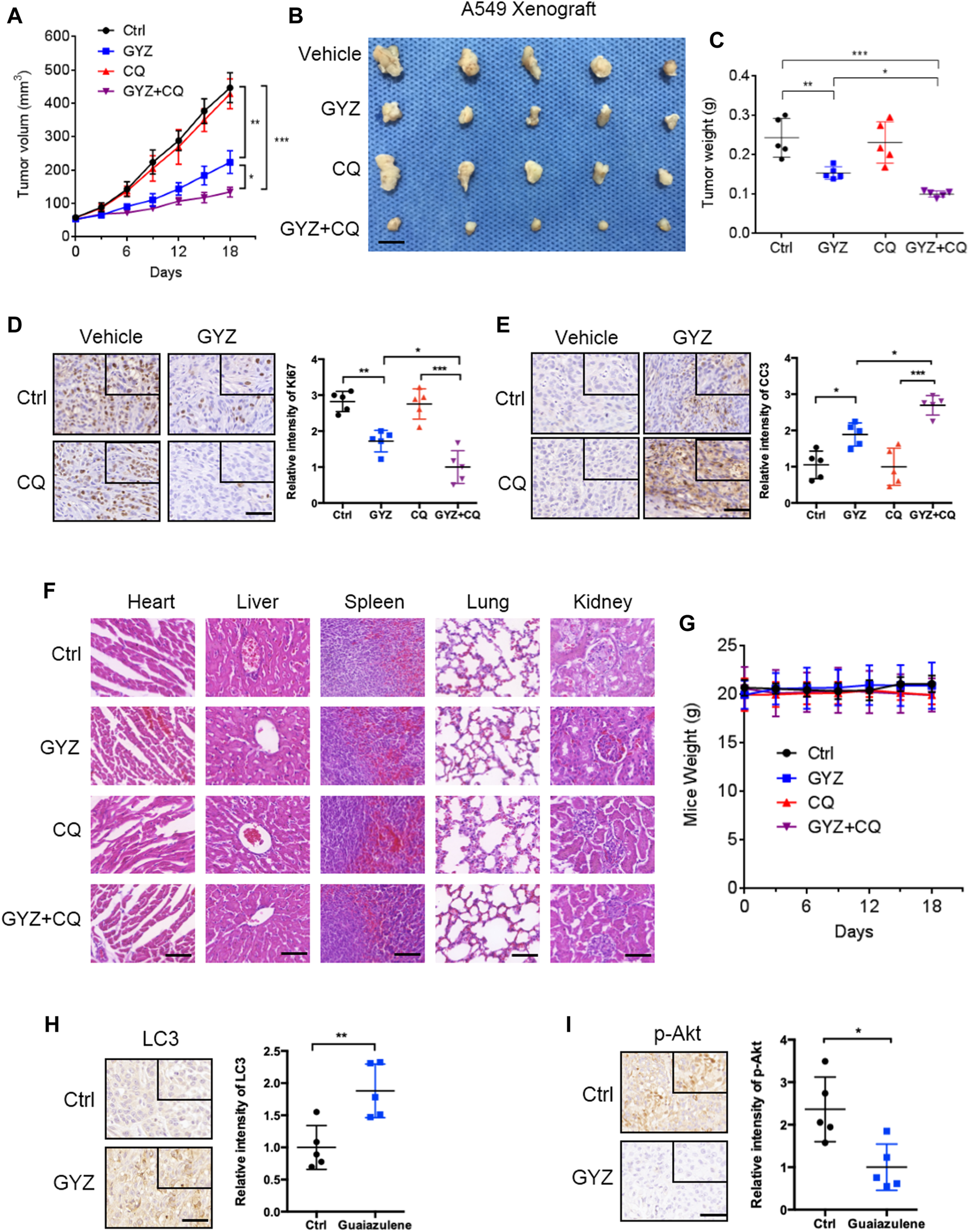 GYZ exhibits antitumor effect against NSCLC in vivo. (A) The volume of tumors from vehicle-, GYZ-, CQ-, or GYZ + CQ-treated mice (five mice per group) bearing A549 subcutaneous tumor xenografts was examined at the indicated time points. (B) The images of isolated tumors were shown. The isolated tumors were A549 subcutaneous tumor xenografts from vehicle-, GYZ-, CQ-, or GYZ+CQ-treated mice. Scale bars, 1 cm. (C) The weight of tumors from vehicle-, GYZ-, CQ-, or GYZ+CQ-treated group. (D) Immunohistochemistry analysis for Ki67 expression in tumor tissues from A549 xenografts treated with vehicle, GYZ (25 mg/kg/day), CQ (15 mg/kg/day), or GYZ+CQ. Scale bars, 50 μm. (E) Immunohistochemistry analysis for cleaved-caspase 3 expression in tumor tissues from A549 xenografts treated with vehicle, GYZ (25 mg/kg/day), CQ (15 mg/kg/day), or GYZ+CQ. Scale bars, 50 μm. F) Hematoxylin and eosin staining of the lung, liver, heart, spleen and kidney in mice treated with vehicle, GYZ (25 mg/kg/day), CQ (15 mg/kg/day), or GYZ+CQ. Scale bars, 100 μm. G) The weight of mice from vehicle-, GYZ-, CQ-, or GYZ + CQ-treated group. (H,I) Tumor tissues from A549 xenografts treated with vehicle or GYZ were assessed by immunohistochemistry analysis for LC3, and p-Akt expression. Scale bars, 50 μm. All data are means ± SD. *p < 0.05, **p < 0.01, ***p < 0.001.