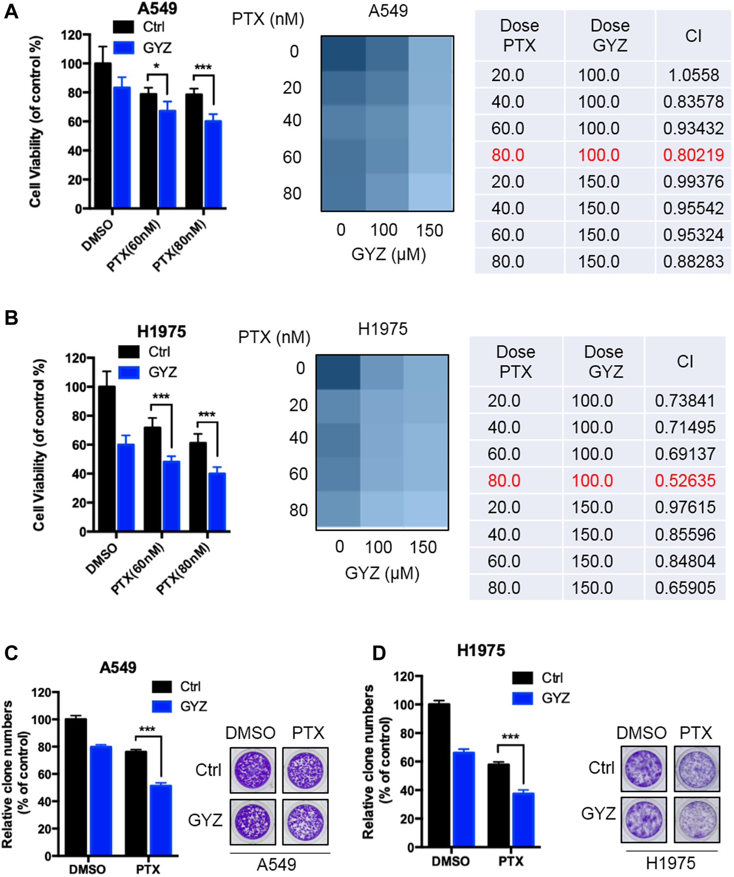 GYZ synergizes with PTX to suppress the growth of NSCLC cells. (A,B) A549 cells (A) and H1975 cells (B) were treated with paclitaxel (PTX) as the indicated doses in the absence or presence of GYZ (100 μM) for 48 h. Cell growth was evaluated by MTT assay. The combination index (CI) of two drugs was listed. (C,D) A549 cells (C) and H1975 cells (D) were treated with PTX as the indicated doses in the absence or presence of GYZ (100 μM) for 2 weeks. Cell proliferation was performed by colony-formation assay. All data are means ± SD. *p < 0.05, ***p < 0.001.