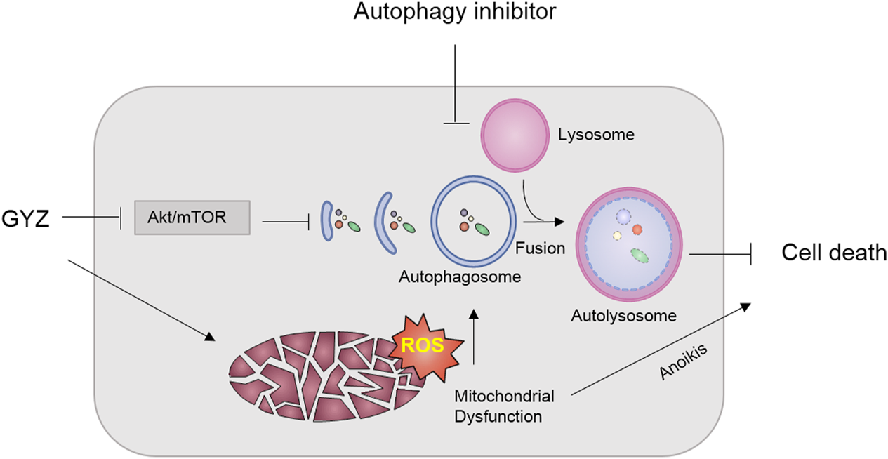 Schematic illustrating the mechanism of GYZ treatment accompanied with autophagy inhibition in NSCLC. On the one hand, GYZ induced mitochondrial dysfunction and increased the ROS level, thereby triggering anoikis in NSCLC; On the other hand, GYZ induced the formation of autophagosome and the fusion and degradation of autolysosome by blocking Akt/mTOR axis, resulting in cytoprotective autophagy and impaired anti-tumor effects of GYZ. Therefore, co-treatment with autophagy inhibitors could enhance the anti-tumor effects of GYZ in NSCLC.