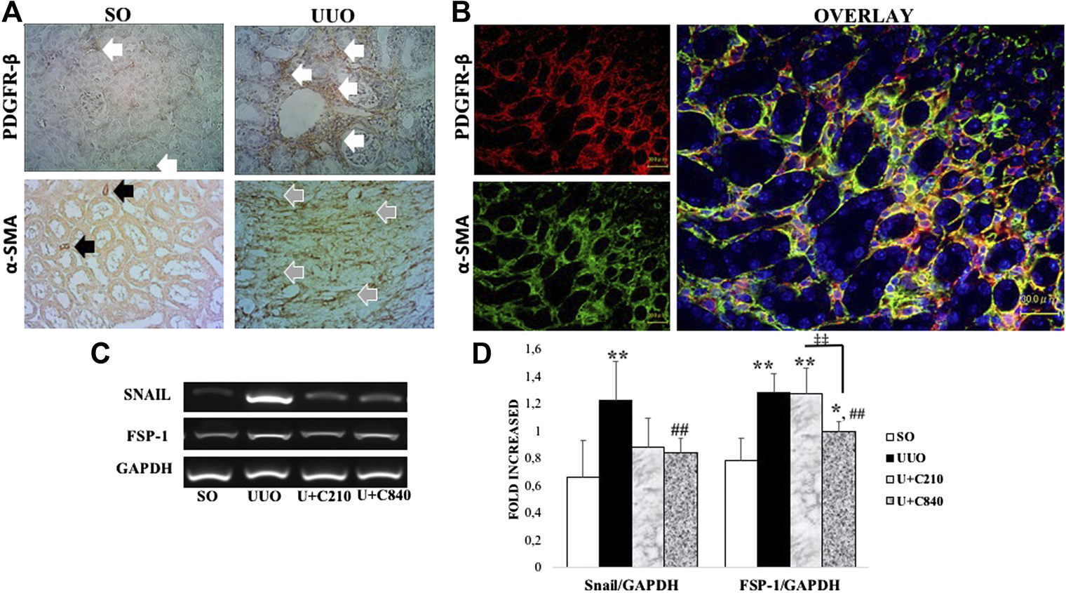 CeA treatment attenuated mesenchymal transition with downregulation of FSP-1 and snail mRNA expression. (A) Immunotaining of fibroblast (PDGFR-β) and myofibroblast (α-SMA). Fibroblast were stained in interstitial areas of SO group, meanwhile fibroblast expansion occurred in UUO as shown by expansion of positive staining in interstitial areas (white arrows). Positive staining of α-SMA showed smooth muscle cells of vessels (black arrows) in SO, meanwhile α-SMA revealed myofibroblast in interstitial areas of UUO group (grey arrows). (B) Double immunofluorescence staining demonstrated colocalization of fibroblast (red) and myofibroblast (green) which revealed fibroblast to myofibroblast transition. (C,D) Representative picture and semiquantitative analysis of RT-PCR analysis showed Snail and FSP-1 mRNA expressions.
