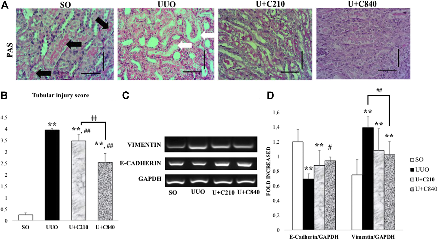 CeA treatment ameliorated tubular injury with upregulation of E-cadherin. (A) Representative figures of tubular injury shown by PAS staining. SO group demonstrated normal kidney architecture with brush border and intact tubules (black arrows). UUO group represented tubular injury with brush border loss, tubular dilatation and tubular epithelial cells effacement (white arrows). Ameliration of tubular injury in CeA treated group with brush border availability. (B) Bar charts showing tubular injury score. (C,D) Representative pictures and densitometry analysis of gel electrophoresis results of Vimentin and E‐Cadherin mRNA expressions based on RT‐PCR. *p < 0.05 vs SO; **p < 0.001 vs SO, #p < 0.05 vs UUO; ##p < 0.01 vs UUO, ‡p < 0.05 vs U+C210, ‡‡p < 0.01 vs U+C210.