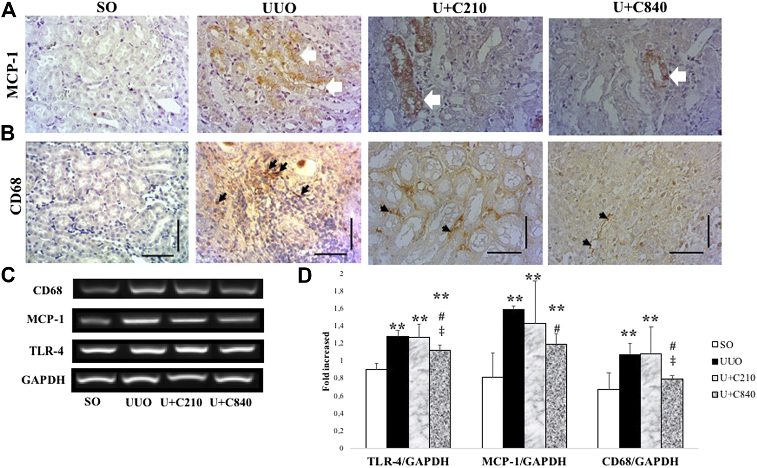 Results: We observed a significantly higher interstitial fibrosis area fraction and tubular injury (p < 0.001) with fibroblast expansion and myofibroblast formation in the UUO group than in the SO group. These findings were associated with higher mRNA expression of TGF-β, Collagen-1, Snail, vimentin, FSP-1, CD68, TLR4, and MCP-1 and lower mRNA expression of E-cadherin. The U+C840 group had a significantly lower tubular injury score and interstitial fibrosis area fraction, which associated with downregulation of mRNA expression of TGF-β, Collagen-1, Snail, vimentin, FSP-1, CD68, TLR4, and MCP-1, with upregulation of mRNA expression of E-cadherin. Immunostaining observation revealed the U+C840 group demonstrated reduction of macrophage infiltration and myofibroblast expansion.