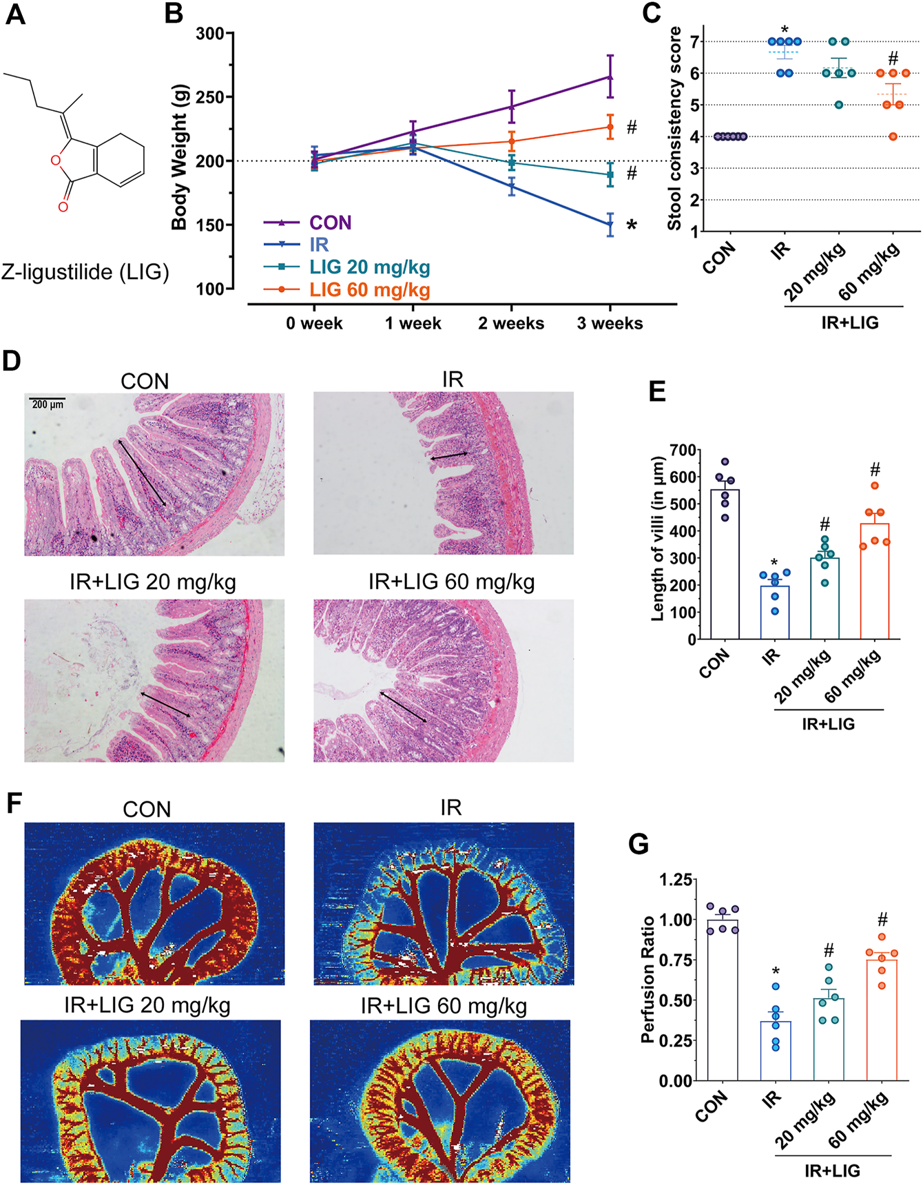 Effects of LIG on RE. (A) Molecular structure diagram of LIG. Rats received 4 Gy of IR and intraperitoneal injection of LIG daily (20 or 60 mg/kg). Rat (B) body weights and (C) stool consistency was recorded weekly. (D) Representative histopathological images showing the extent of jejunum damage after 3 weeks of IR with or without LIG (20 or 60 mg/kg, per day) and (E) alterations in villus length. (F) Representative laser Doppler perfusion images of rat samples after 3 weeks of IR with or without LIG and (G) laser Doppler perfusion ratios showing alterations in intestinal perfusion. CON, control group; IR, ionizing radiation; LIG, ligustilide. Data are the mean ± SEM; n = 6. *p < 0.05, significantly different from the CON group; #p < 0.05, significantly different from the IR group.