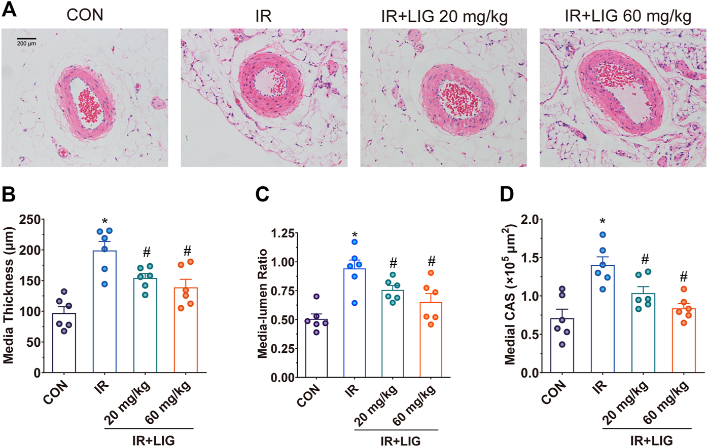 Effects of LIG on mesenteric artery remodeling in rats after IR. (A) Representative hematoxylin-eosin staining histopathological images after 3 weeks of IR. Vascular remodeling was evaluated by (B) media thickness, (C) media-lumen ratio, and (D) medial CSA. CSA, medial cross-sectional area. Data are the mean ± SEM; n = 6. *p < 0.05, significantly different from the CON group; #p < 0.05, significantly different from the IR group.