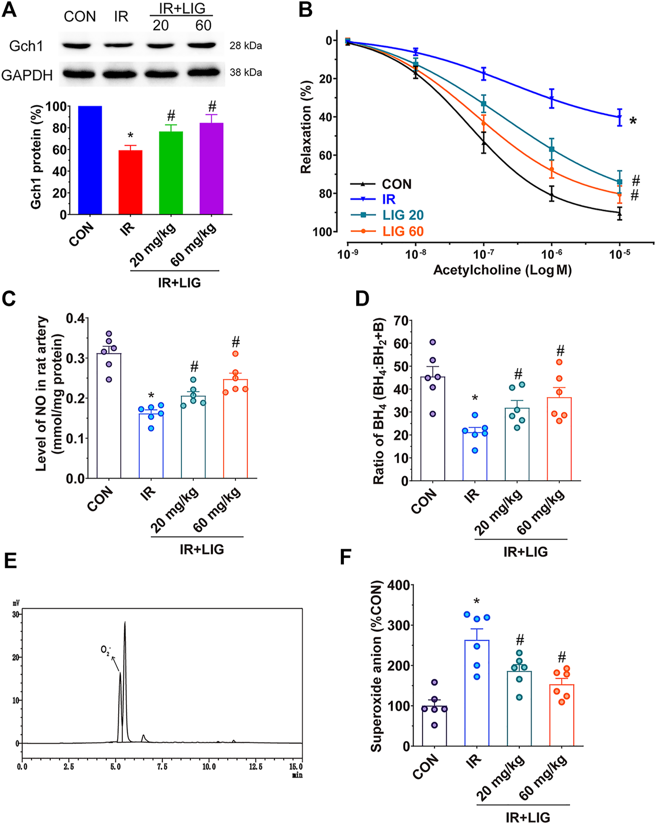 Effects of LIG on Gch1 protein levels, vasodilatory functions and BH4 levels in IR-exposed rat mesenteric arteries. Rats received 4 Gy of IR and intraperitoneal injection of LIG daily for 3 weeks (20 or 60 mg/kg). (A) Representative immunoblots and quantification as band densities showing phosphorylation of Gch1 with GAPDH as a loading control in rat mesenteric arteries (n = 4). (B) Receptor-mediated endothelium-dependent vasodilation after acetylcholine treatment. Aortic rings were precontracted with U46619 (100 nM). (C) The total amount of NO in the mesenteric arteries was determined by a total NO assay kit. (D) Ratio of BH4 to BH2+B in rat mesenteric arteries. (E) Representative chromatogram of superoxide anions detected by HPLC coupled with fluorescence detection in rat mesenteric arteries. (F) Relative quantitation of superoxide anions in rat mesenteric arteries. Data are the mean ± SEM; n = 6. *p < 0.05, significantly different from the CON group; #p < 0.05, significantly different from the IR group.