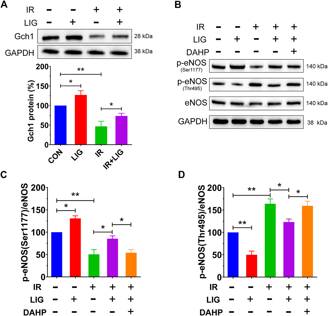 The effects of LIG on Gch1 protein levels in HUVECs were investigated by western blot, and the results showed that LIG could significantly improve the protein level of Gch1 compared with the control group. Compared to the IR group, LIG significantly improved the Gch1 reduction due to IR (Figure 5A).