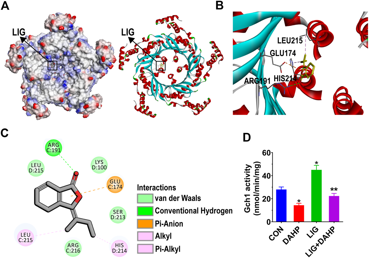 Structural interactions of LIG with Gch1 and their effects on activity. (A) Surface of Gch1 colored by ionizability. The black rectangle marks LIG. (B) Structural representation of LIG binding to Gch1 (PDB: 1WUR) as inferred from docking simulations. LIG is shown as yellow sticks. (C) 2D diagram of the interaction between LIG and Gch1 showing the major binding sites and bonding forces. (D) Gch1 activity quantified by fluorescence detection. The fused or free Gch1 protein was incubated in the dark with GTP assay buffer (310 μM). DAHP was added at a concentration of 1 mM. Data are the mean ± SEM, n = 6. *p < 0.05, significantly different from the CON group, **p < 0.05, significantly different from the LIG group.