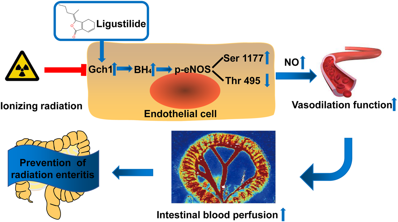 Schematic illustration. Ligustilide prevents radiation enteritis by targeting to improve the levels of Gch1 and eNOS phosphorylated s1177 proteins in vascular endothelial cells after ionizing radiation, increase the production of BH4 and NO, correct vascular diastolic function, and maintain intestinal blood perfusion.