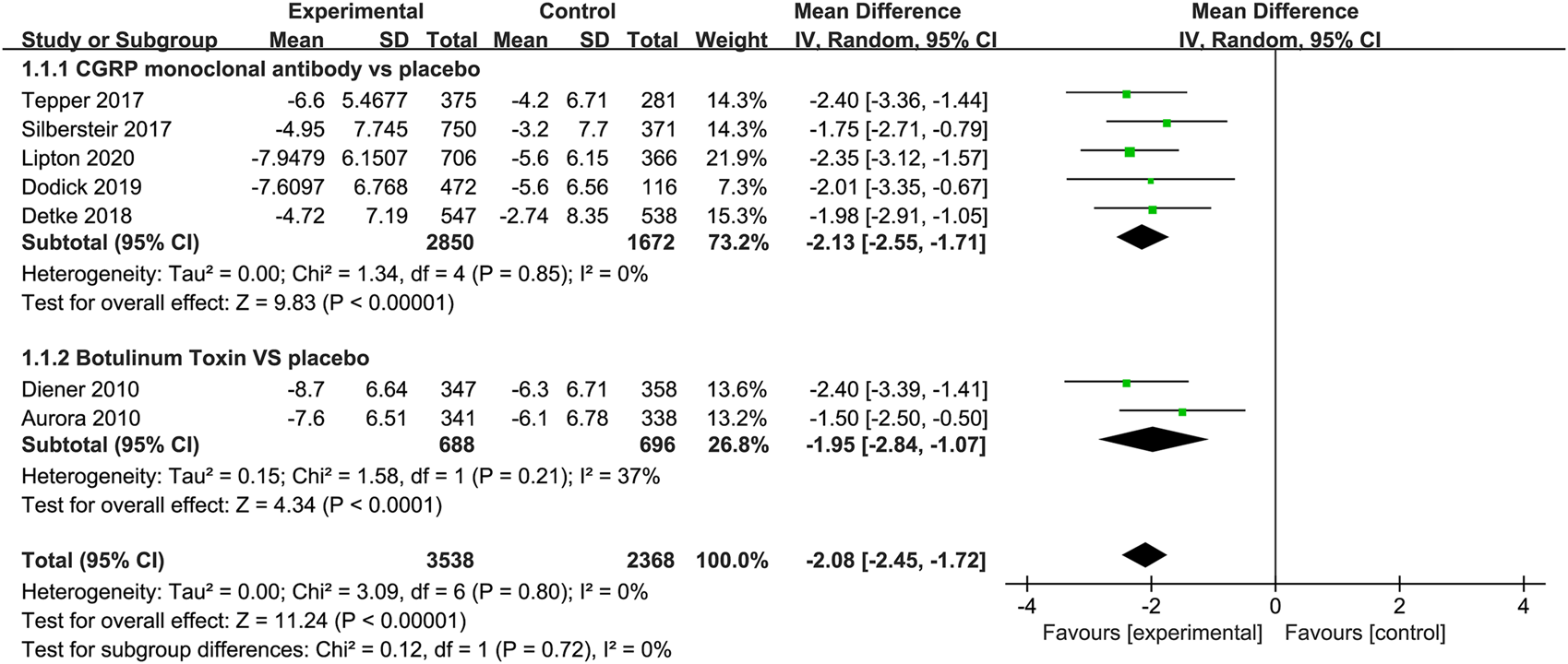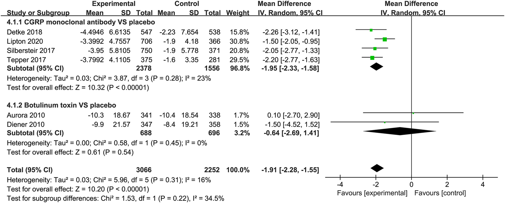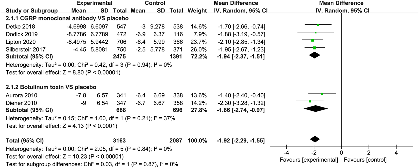 The studies listed in the meta-analysis showed that CGRP monoclonal antibody was superior to placebo in the mean change from baseline in headache days (WMD = −1.94, 95% CI: −2.37 to −1.51, p < 0.001). While in botulinum toxin vs. placebo, the change of headache days was also statistically significant (WMD = −1.86, 95% CI: −2.74 to −0.97, p < 0.001), with low heterogeneity (I2 = 37%; Figure 4).