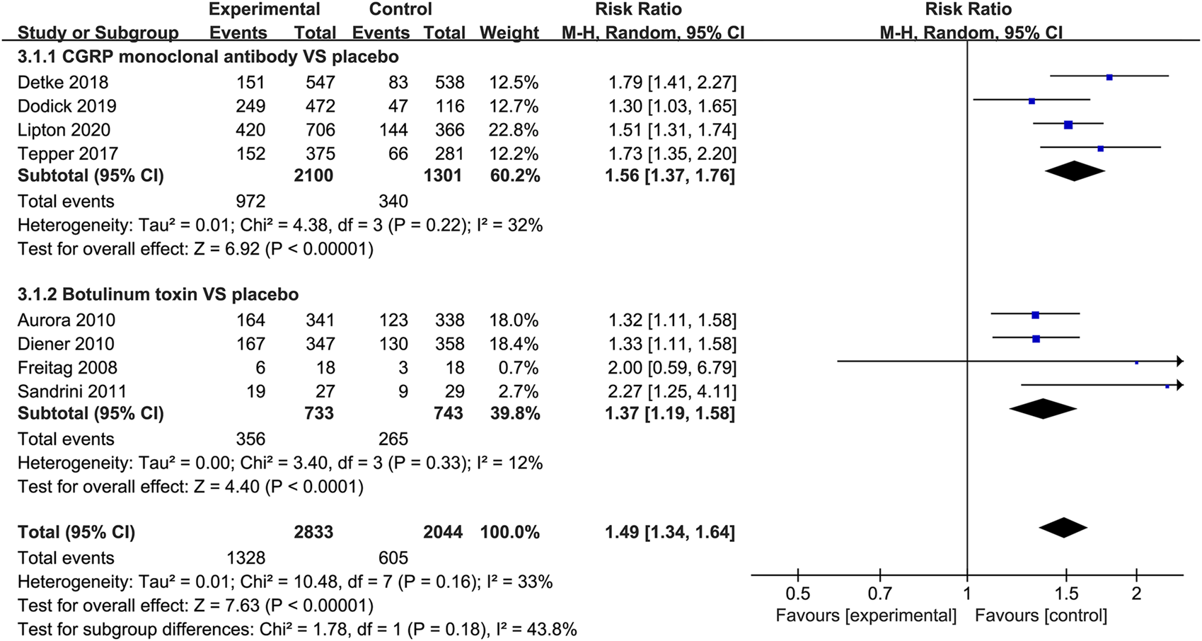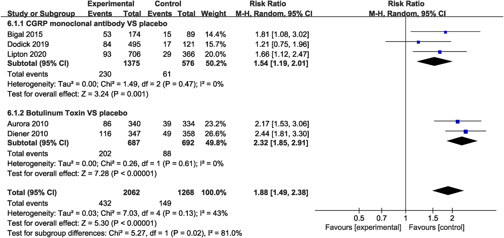 When measured by the 50% migraine responder rate, CGRP monoclonal antibody was related to a higher response rate than the placebo group (RR = 1.56, 95% CI: 1.37 to 1.76, p < 0.001), with low heterogeneity (I2 = 32%). The use of botulinum toxin was also associated with the increased 50% migraine response rate compared with placebo (RR = 1.37, 95% CI: 1.19–1.58, p < 0.001, I2 = 12%; Figure 5).