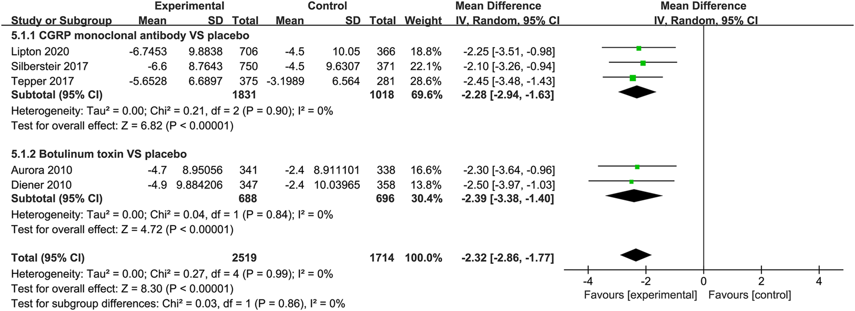 The reduction in acute medication days in the CGRP monoclonal antibody group was greater than that in the placebo group (WMD = 1.95, 95% CI = −2.33 to −1.58, p < 0.001, I2 = 0%). In the botulinum toxin vs. placebo trials, the difference between the two groups was small (WMD = −0.64, 95% CI: −2.69 to 1.41, p = 0.54). The botulinum toxin group did not relate to less acute analgesic intake (Figure 6).