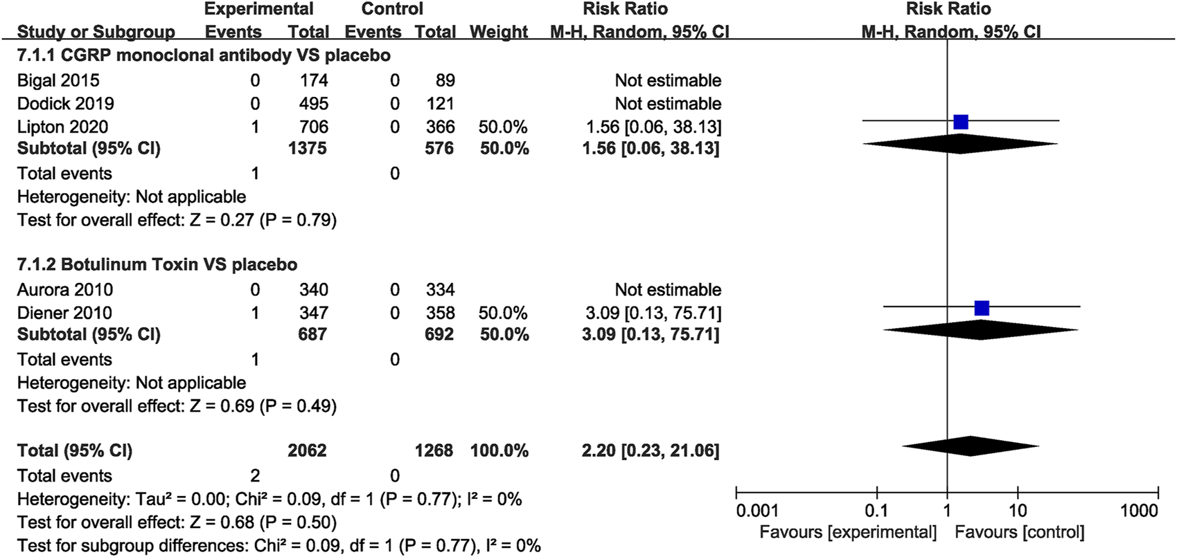 Pooled treatment–related serious AEs’ relative risk in CGRP monoclonal antibody and botulinum toxin.