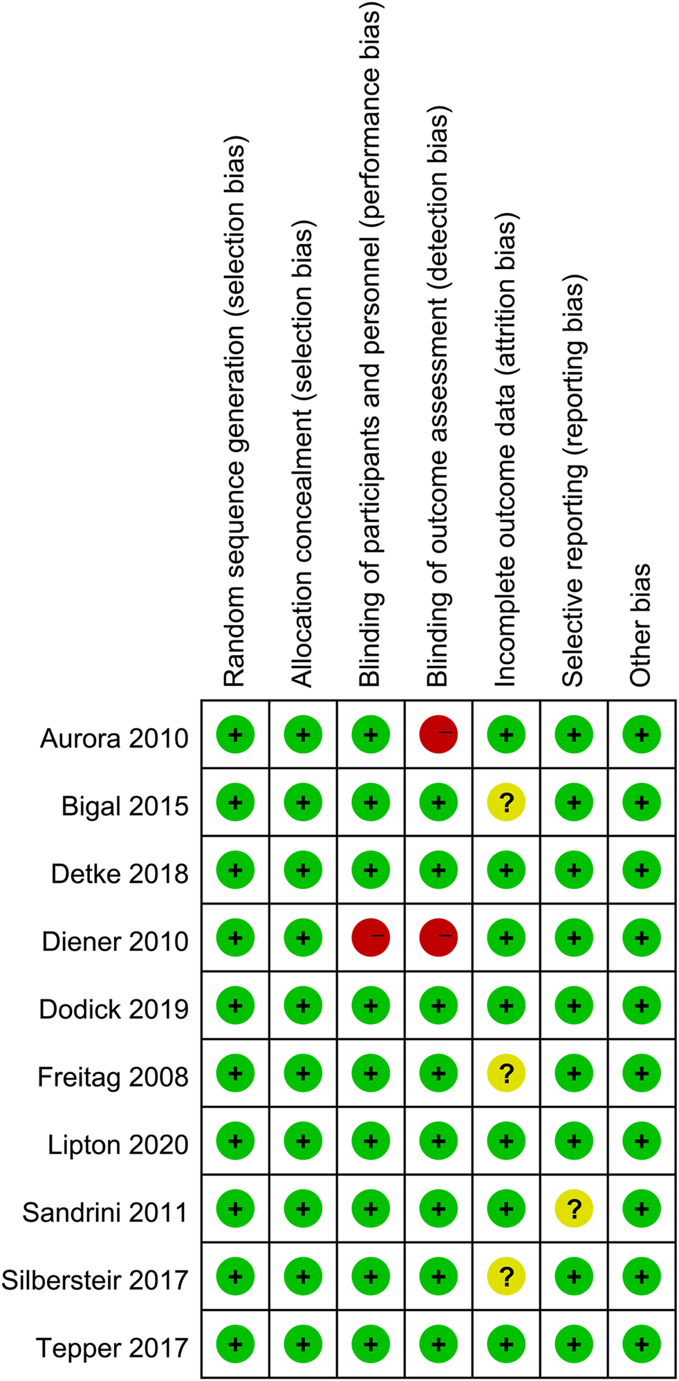 The independent risk of bias of the ten included studies is detailed in Figure 10. The bias risk of blind assessment of outcome data was high in the Aurora and Diener studies. Also, the Diener study had high performance bias. For incomplete outcome data, the Bigal, the Freitag, and the Silbersteir studies had unclear risk of bias. And the Sandrini study had an unclear risk of bias of selective reporting. In addition to these measures, other studies had low risks of bias.