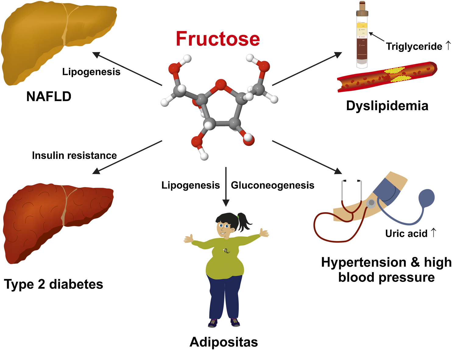 Deleterious effects of a high fructose intake on human health. Excessive fructose consumption is a risk factor for several chronic diseases including non-alcoholic fatty liver disease (NAFLD), obesity, dyslipidemia, insulin resistance/diabetes type 2, arterial hypertension, and hyperuricemia.