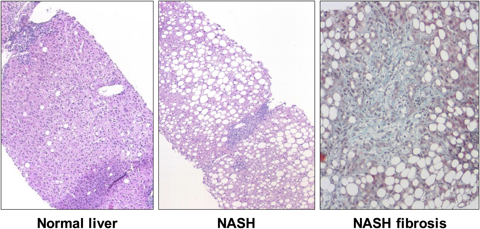 Histopathology of nonalcoholic steatohepatitis (NASH). Compared to normal liver (left), histologic features of NASH include steatosis, ballooning, and lobular inflammation (middle). Although not a requirement for the histological diagnosis NASH, fibrosis is often paired with the pathological changes (right).
