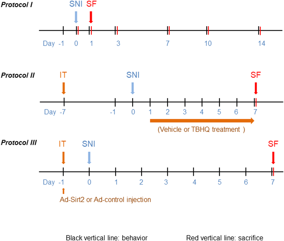 Schematic illustration of the experimental protocols. SNI: spared nerve injury; IT: implantation of lumbar intrathecal catheter; SF: sacrifice.
