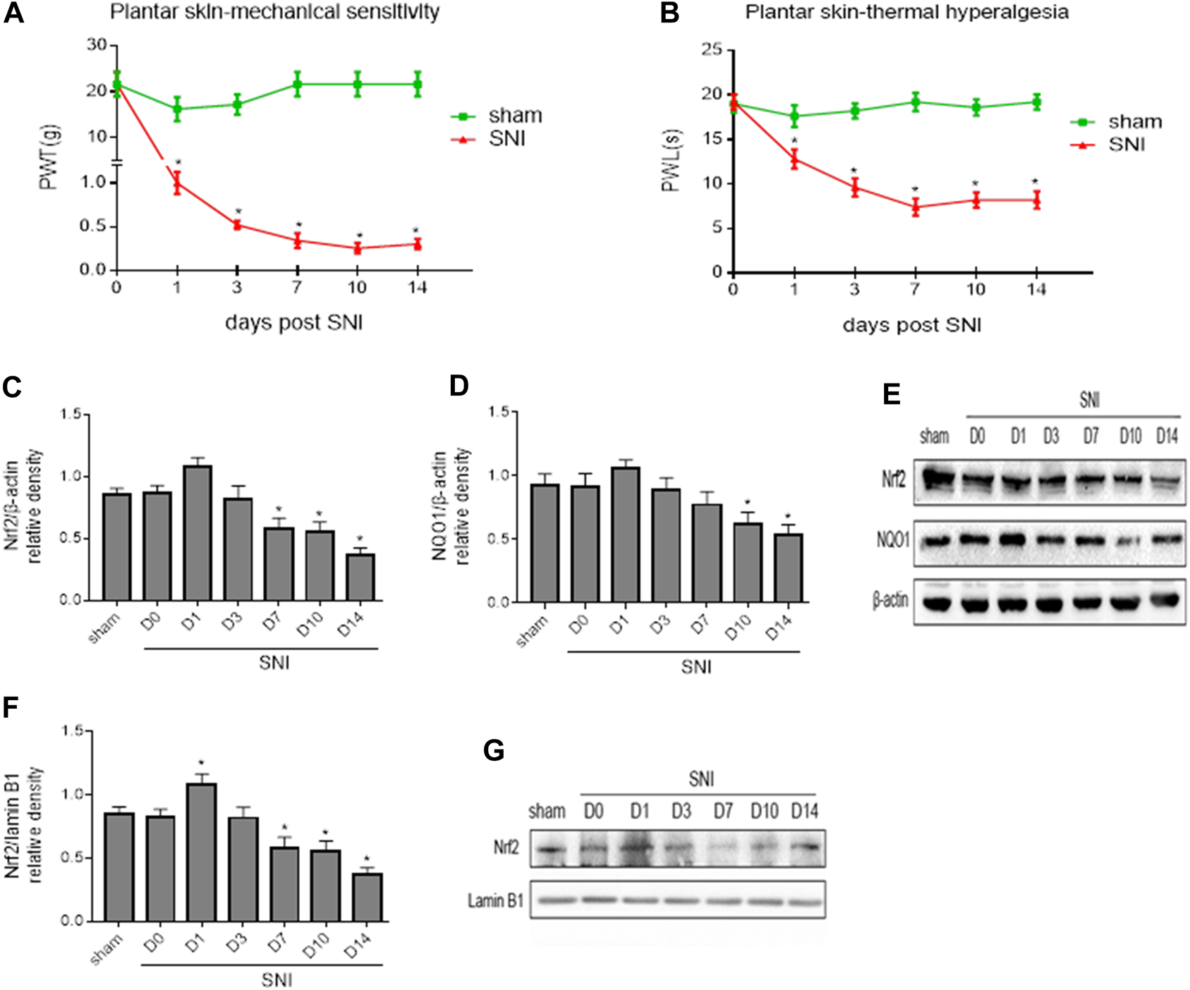 (A,B): Paw withdrawal threshold (PWT) to mechanical stimulation and paw withdrawal latency (PWL) to thermal stimulation before (day 0) and 1, 3, 7, 10 and 14 days after spared nerve injury (SNI) or sham operation. (C–E): The time course of changes in expression of Nrf2 and its downstream target NQO1 in the whole tissue lysates of the spinal cord in SNI rats. (F,G): The time course of changes in expression of Nrf2 in the nuclear fractions of the spinal cord in SNI rats. Sham rats served as control. Values are expressed as mean ± SE (n = 5 for each group). *p < 0.05 vs sham or baseline (day 0).