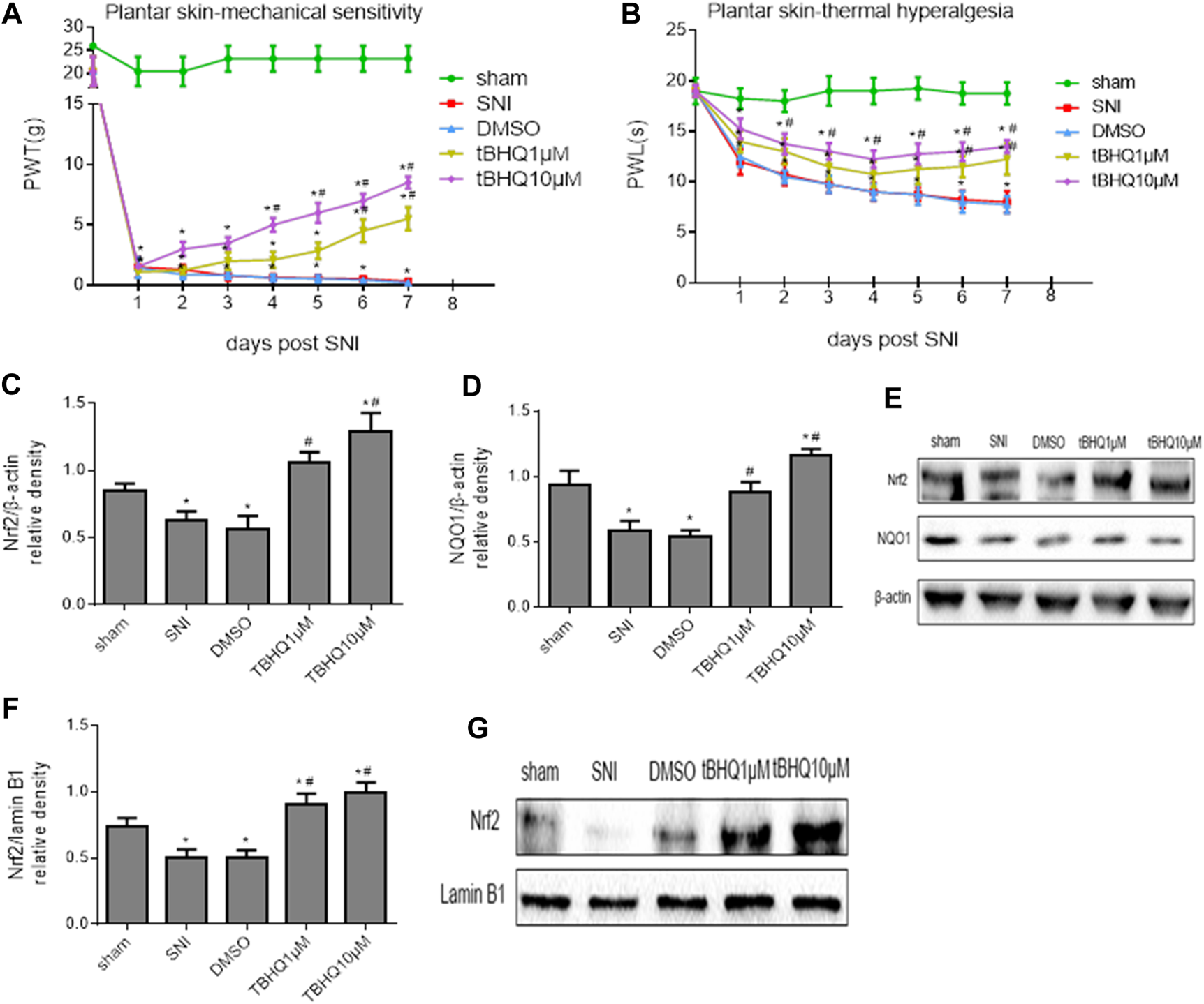 (A,B): Effects of intrathecal injection of DMSO (vehicle) or different doses of Nrf2 agonist tBHQ on mechanical allodynia and thermal hyperalgesia in SNI rats. (C–E): Effects of intrathecal injection of DMSO or different doses of Nrf2 agonist tBHQ on expression of Nrf2 and its downstream target NQO1 in the whole tissue lysates of the spinal cord in SNI rats. (F,G): Effects of intrathecal injection of DMSO and different doses of Nrf2 agonist tBHQ on expression of Nrf2 in the nuclear fractions of the spinal cord in SNI rats. Sham rats without treatment served as control. Values are expressed as mean ± SE (n = 4 for each group). *p < 0.05 vs sham or baseline (day 0); #p < 0.05 vs SNI or DMSO.
