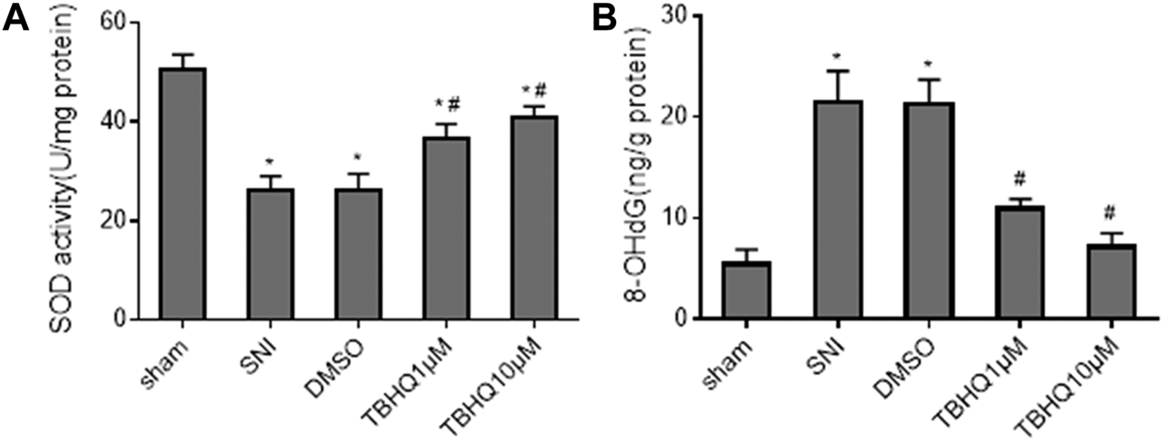 Effects of intrathecal injection of DMSO or different doses of Nrf2 agonist tBHQ on levels of antioxidant enzyme superoxide dismutase (SOD, (A) and oxidative stress marker 8-hydroxy-2′-deoxyguanosine (8-OHdG, (B) in the spinal cord of SNI rats. Sham rats without treatment served as control. Values are expressed as mean ± SE (n = 4 for each group). *p < 0.05 vs sham; #p < 0.05 vs SNI or DMSO.