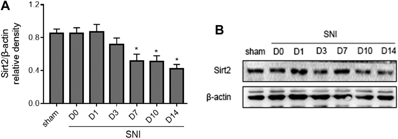 The time course of changes in expression of Sirt2 in the spinal cord in SNI rats. Sham rats served as control. Values are expressed as mean ± SE (n = 5 for each group). *p < 0.05 vs sham or baseline (day 0).