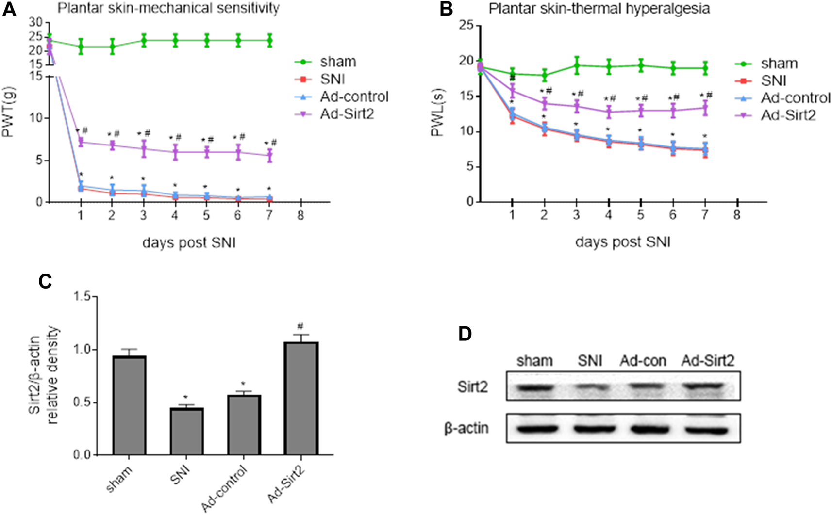 The expression of Sirt2 was significantly lower in the spinal cord of SNI rats without treatment compared with sham rats. Intrathecal Ad-Sirt2 restored expression of Sirt2 in the spinal cord of SNI rats to similar level as in sham group (Figures 7C,D).
