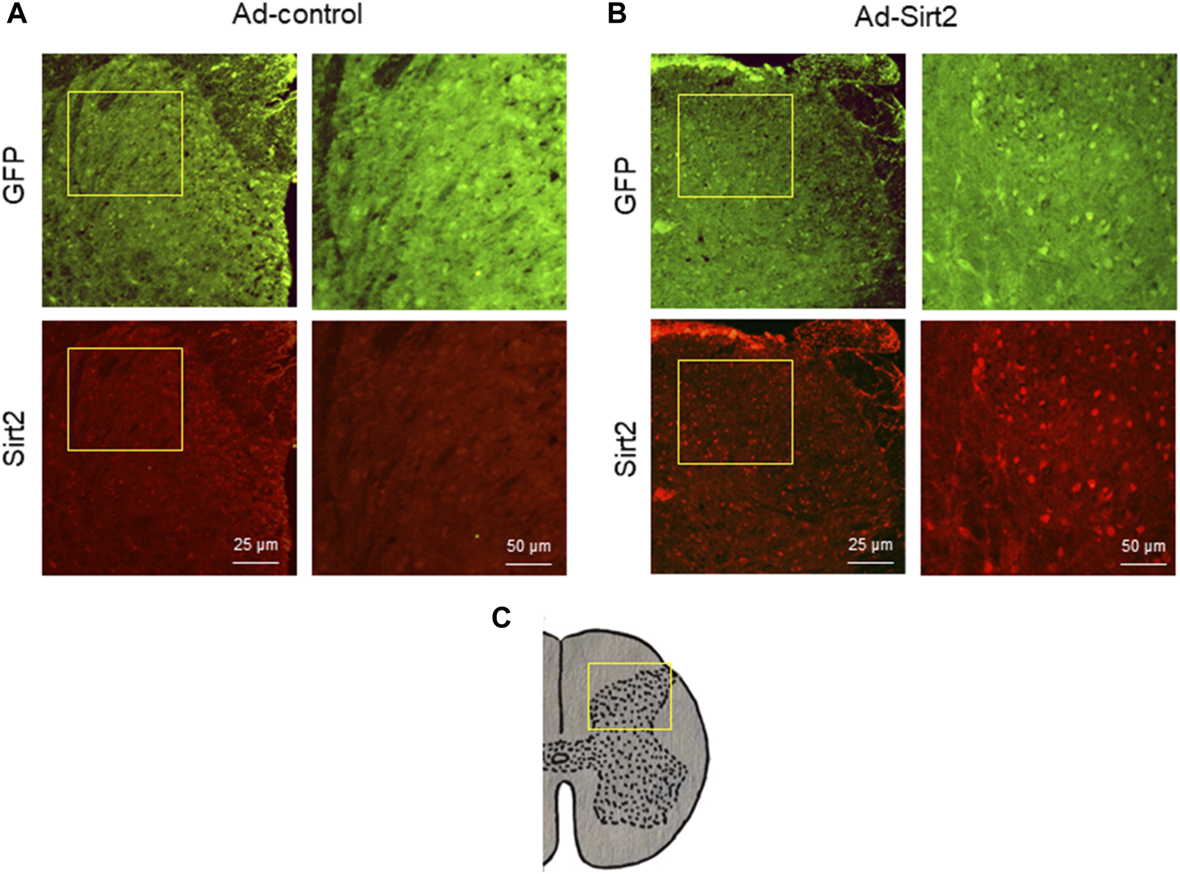 (A,B): Representative confocal images showing GFP (green) and Sirt2 (red) immunoreactivity in the spinal cord of SNI rats treated with Ad-Sirt2 or Ad-control. Right column of images in Ad-control group or Ad-Sirt2 group: higher-power magnification of a section of the left images. (C): Cross section of spinal cord showing where the left column of images in A and B were photographed.